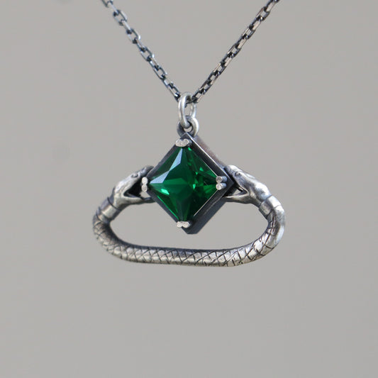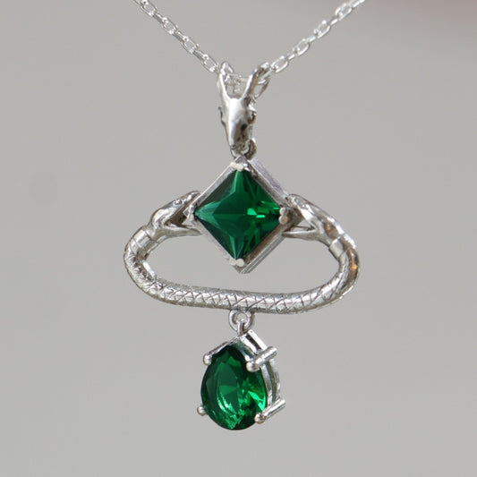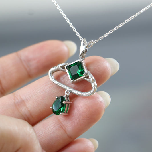 Princess Lab. Double Head Snake 925 Silver Necklace with Emerald and Drop Pendant