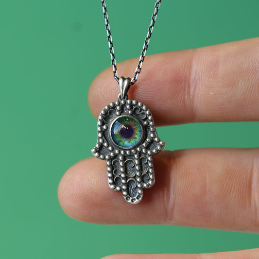 Fatima's Hand Green Eye 925 Oxidized Silver Necklace