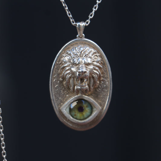 Lion Medallion Green Eye 925 Oxidized Silver Necklace