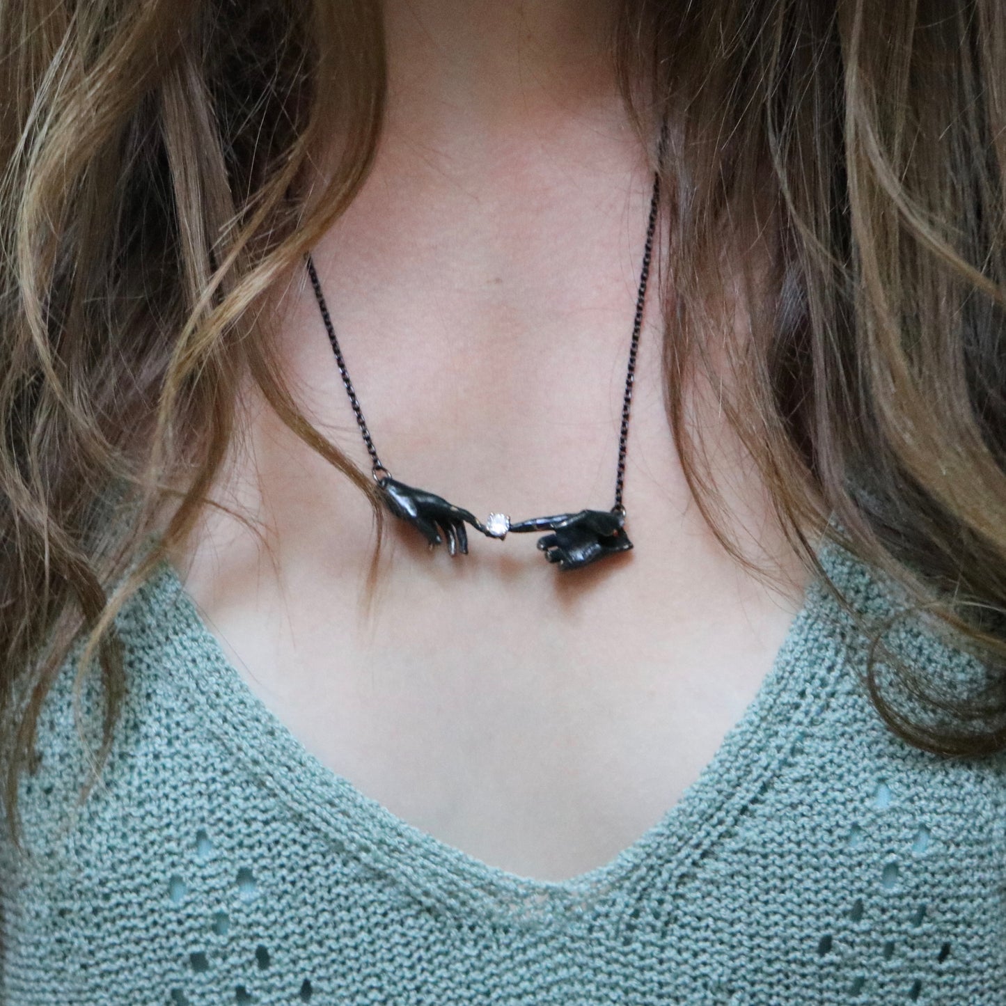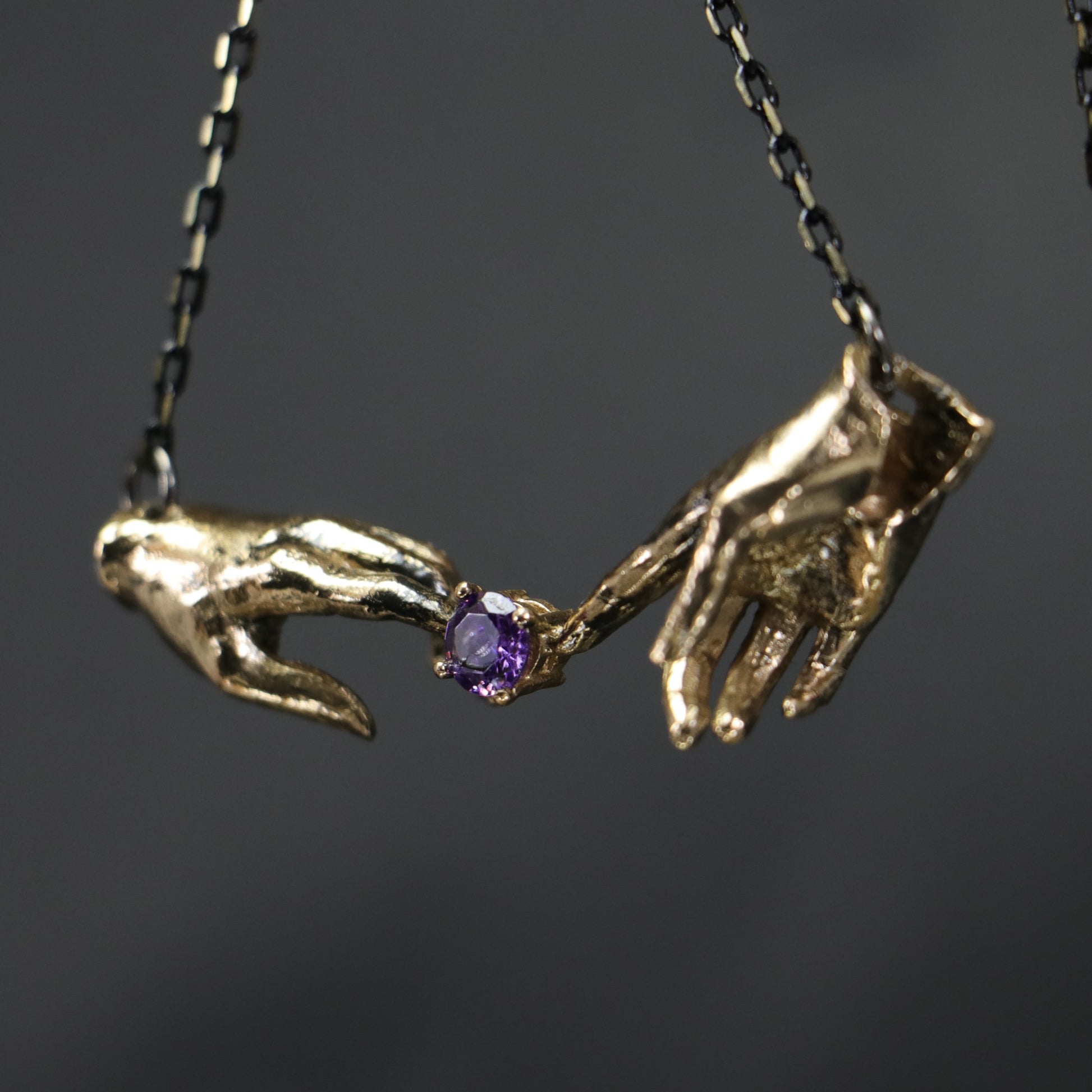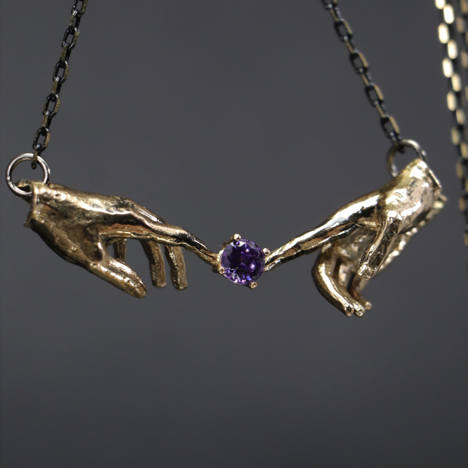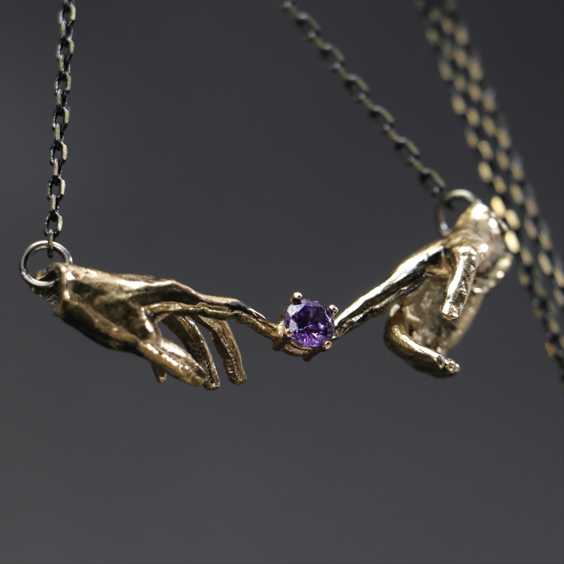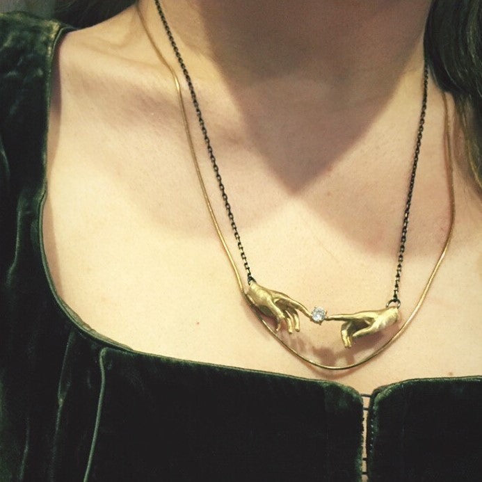 We feel that God, who is speeding through the void, will touch Adam's finger a little later and give him life and Adam's weak body will come to life and rise up. I design the moment right before this touch as a necklace and pay my respects to Michelangelo and his God.