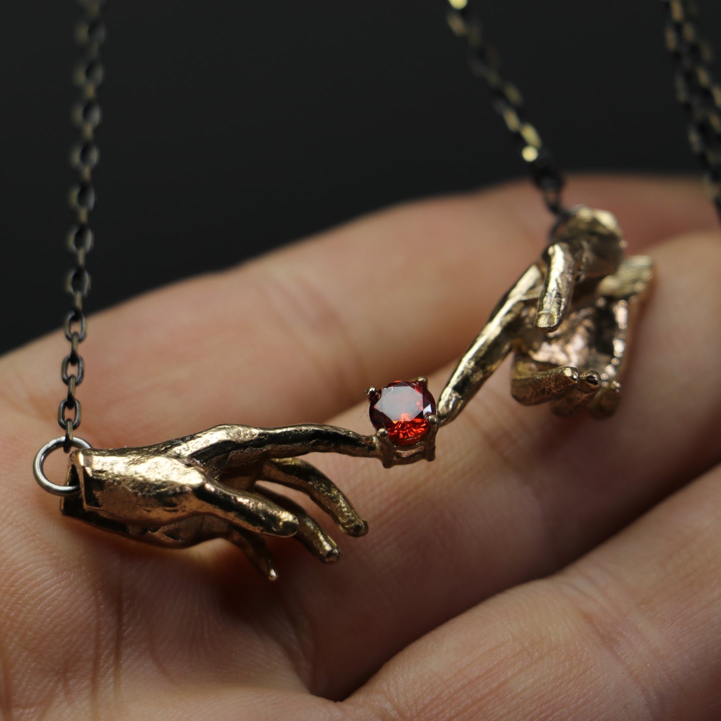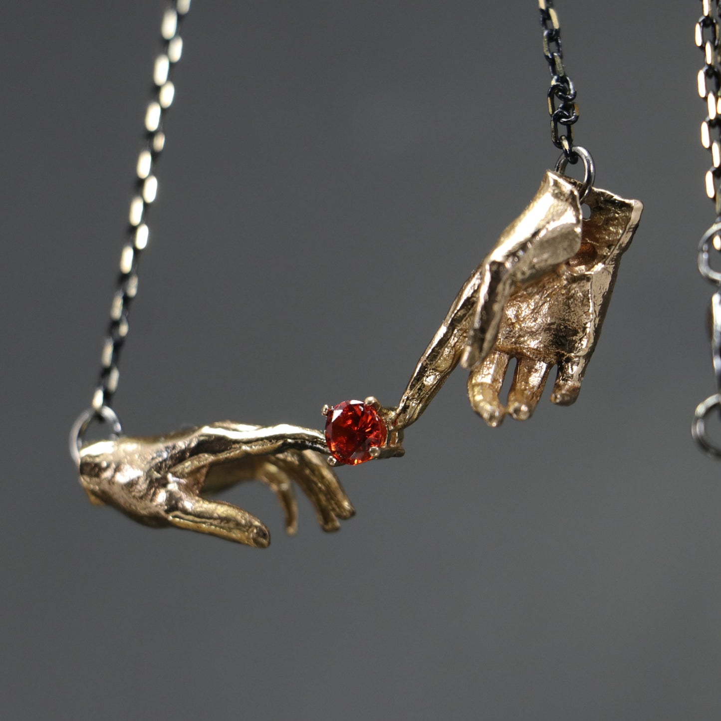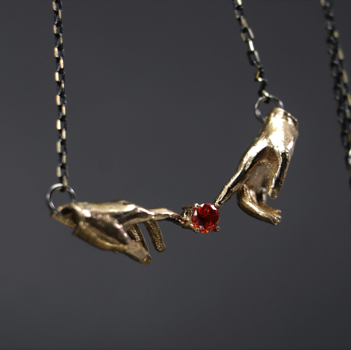 We feel that God, who is speeding through the void, will touch Adam's finger a little later and give him life and Adam's weak body will come to life and rise up. I design the moment right before this touch as a necklace and pay my respects to Michelangelo and his God.