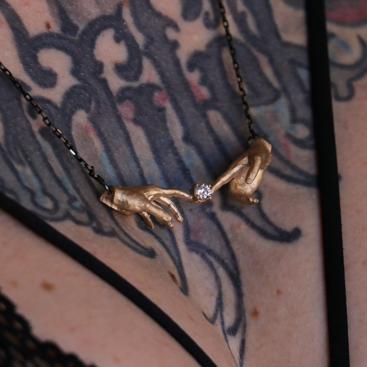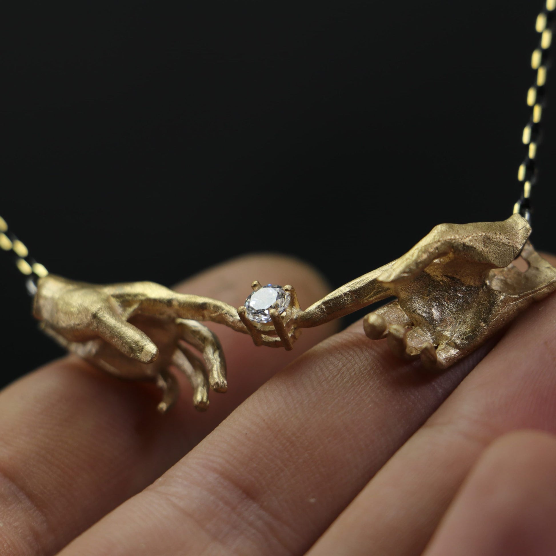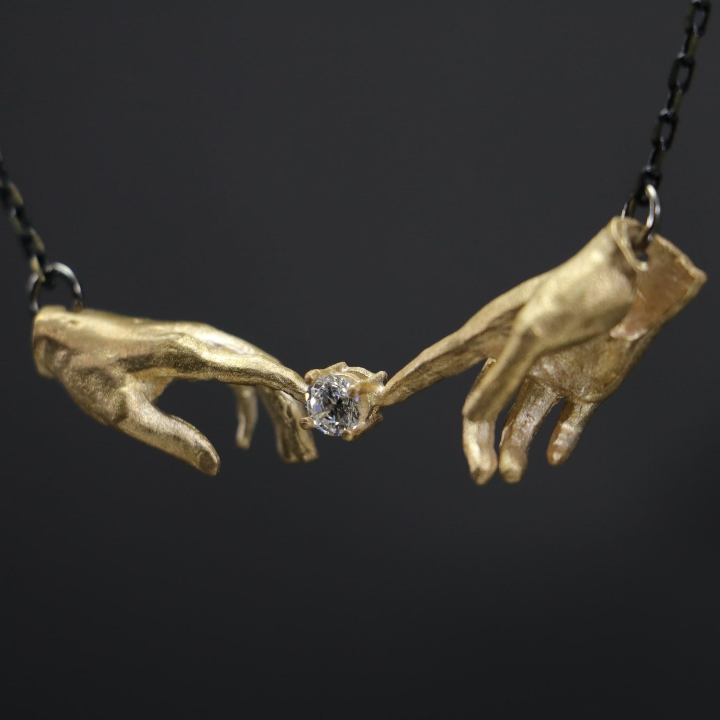 We feel that God, who is speeding through the void, will touch Adam's finger a little later and give him life and Adam's weak body will come to life and rise up. I design the moment right before this touch as a necklace and pay my respects to Michelangelo and his God.