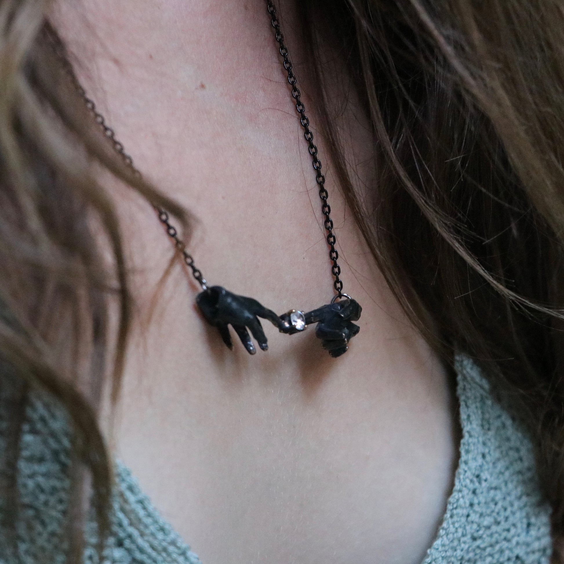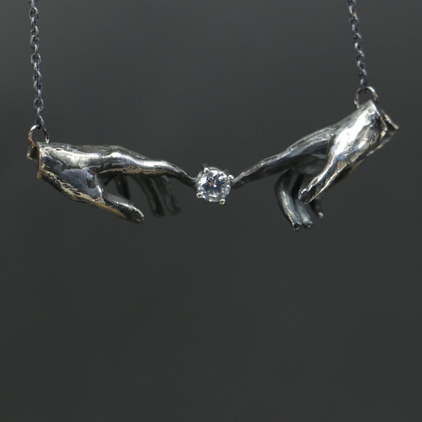 We feel that God, who is speeding through the void, will touch Adam's finger a little later and give him life and Adam's weak body will come to life and rise up. I design the moment right before this touch as a necklace and pay my respects to Michelangelo and his God.