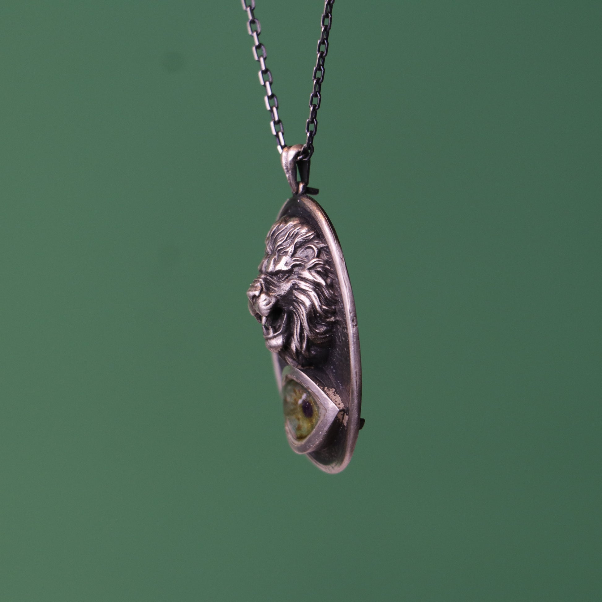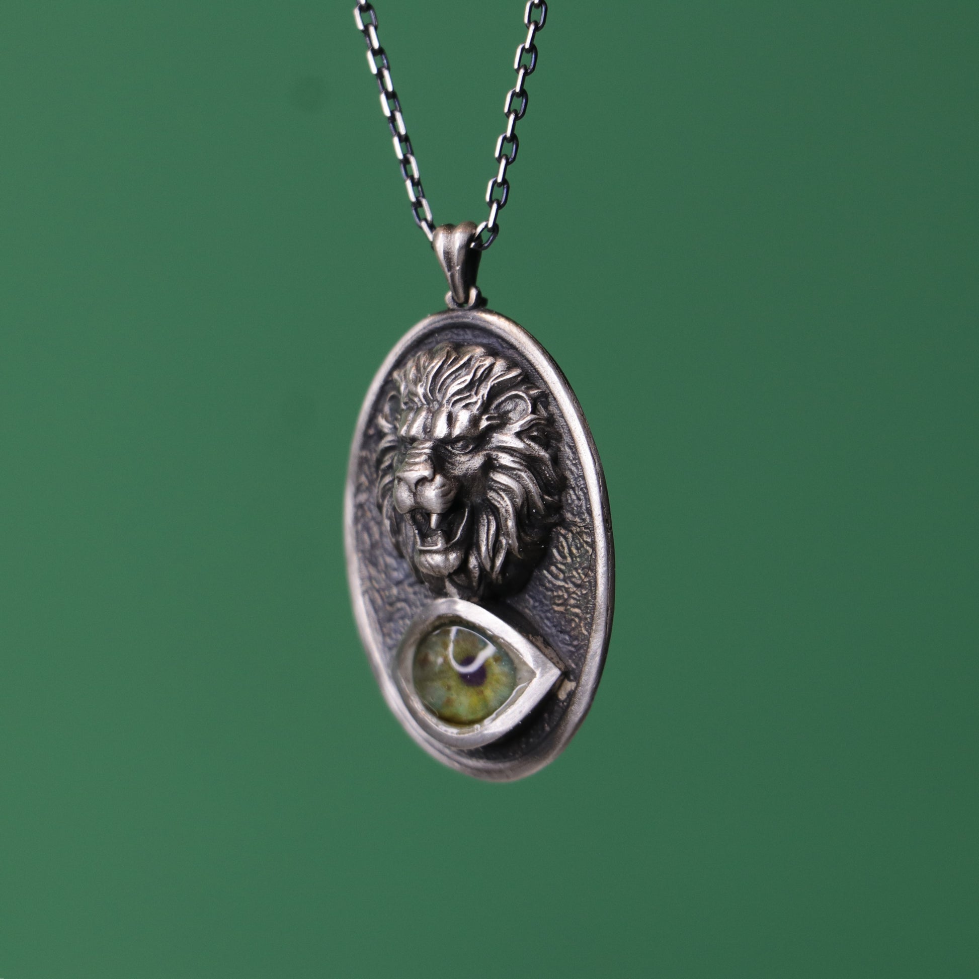 Lion Medallion Green Eye 925 Oxidized Silver Necklace
