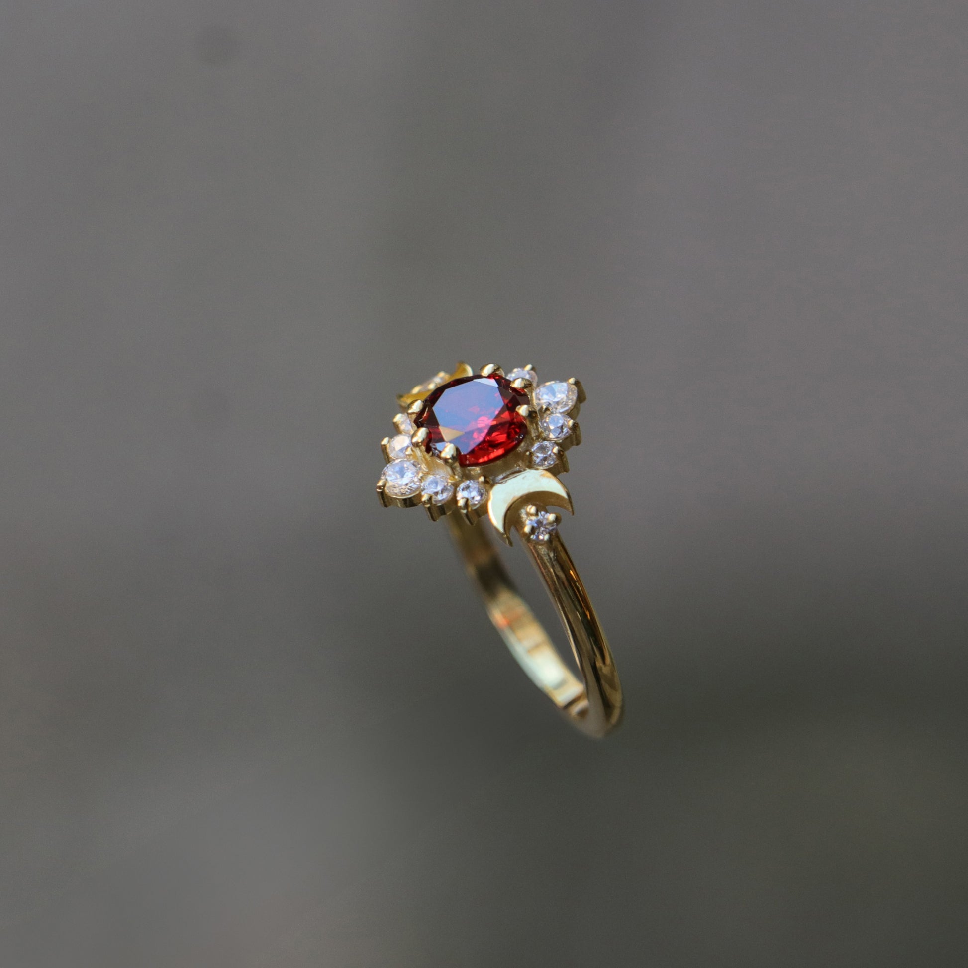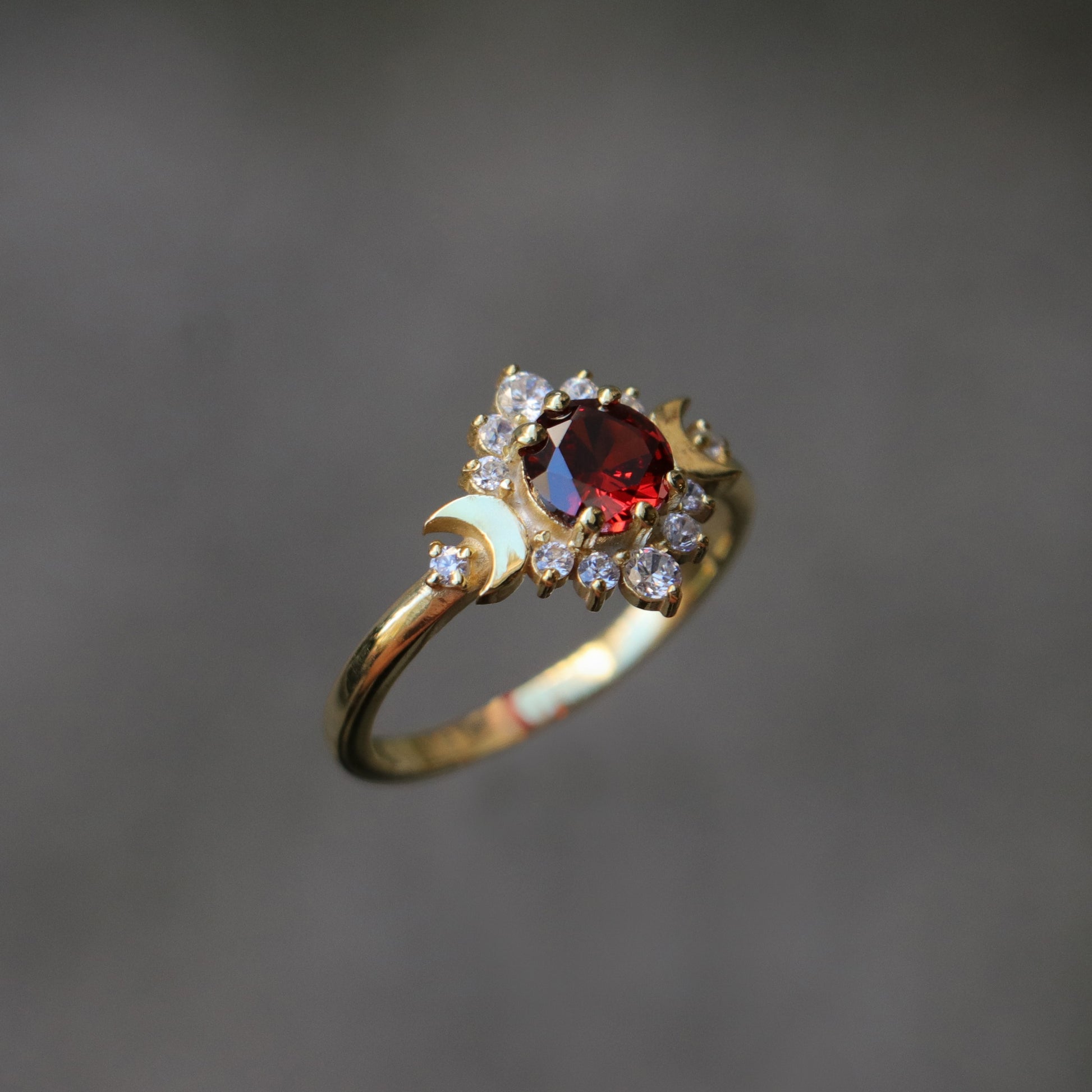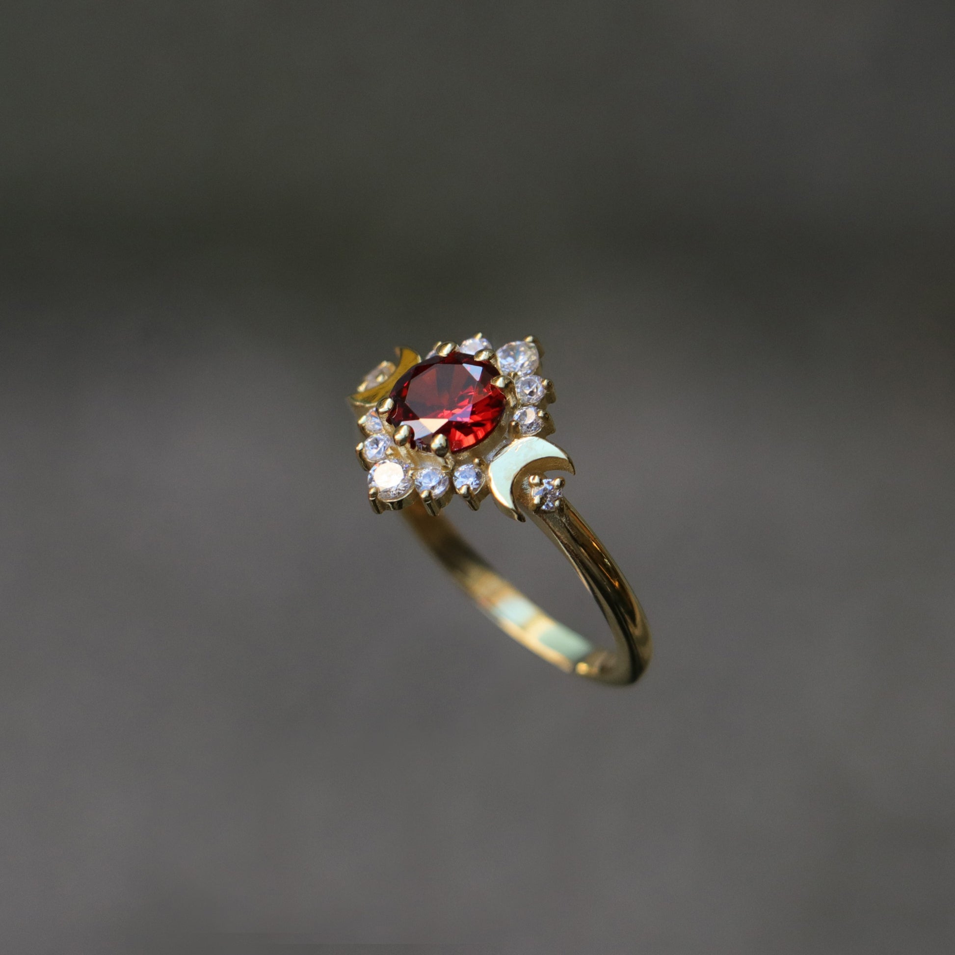 Moon Goddess Garnet and Moissanite 925 Silver Gold Plated Ring