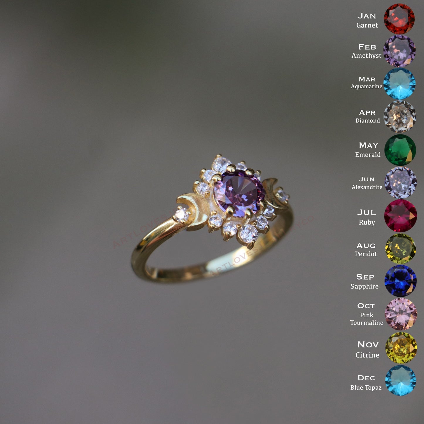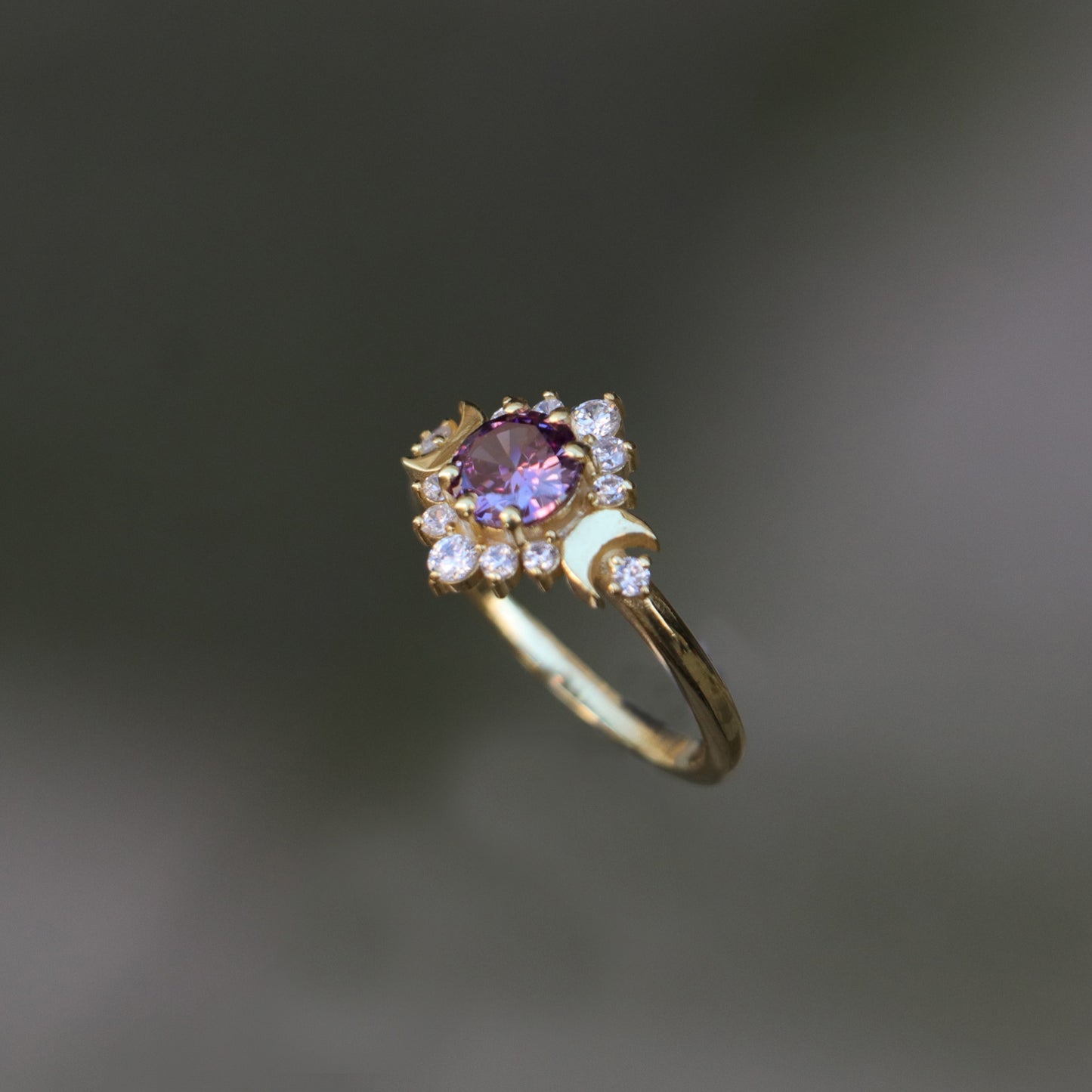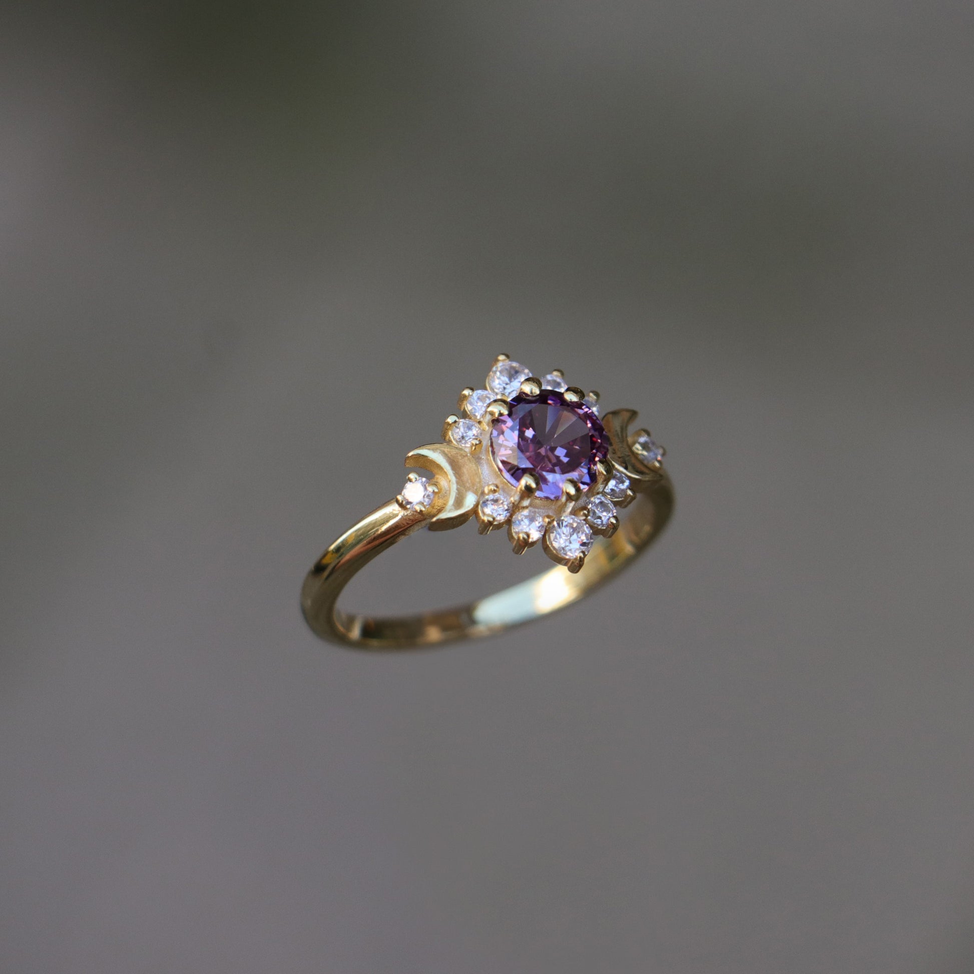 Moon Goddess Amethyst and Moissanite 925 Silver Gold Plated Ring