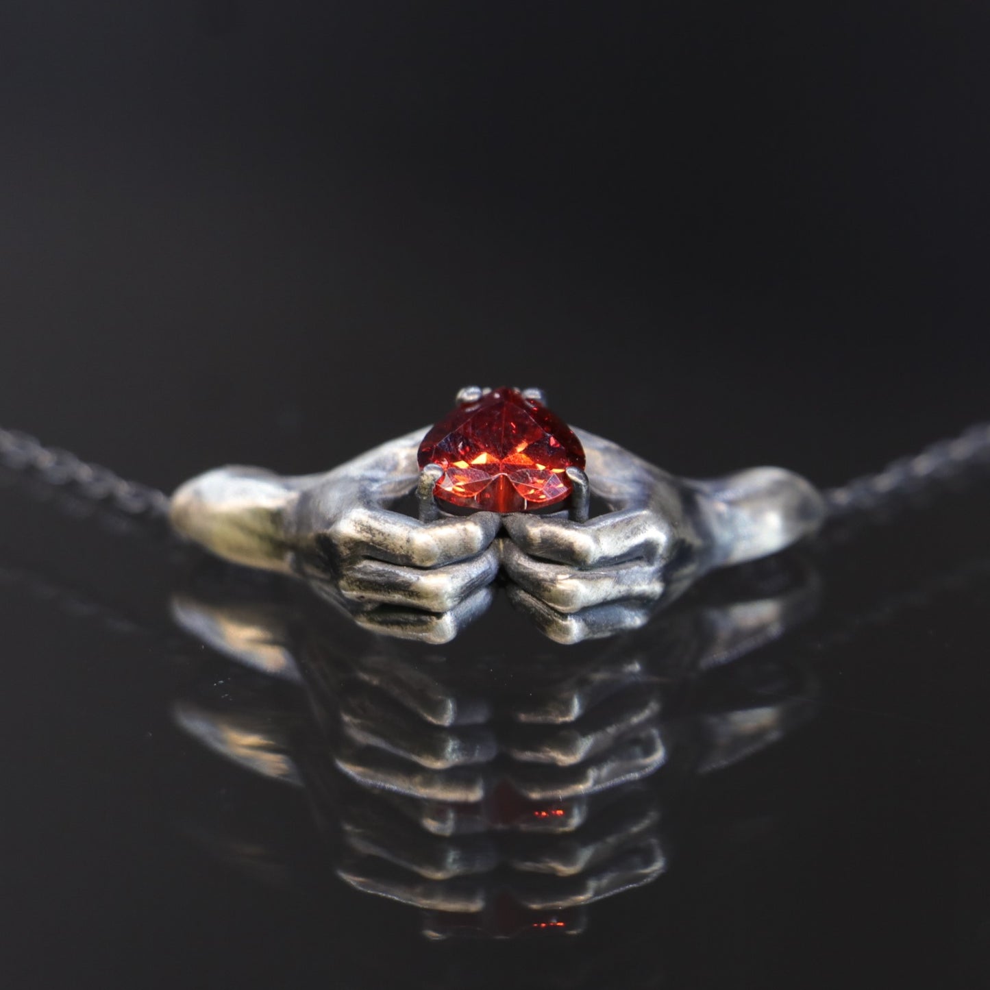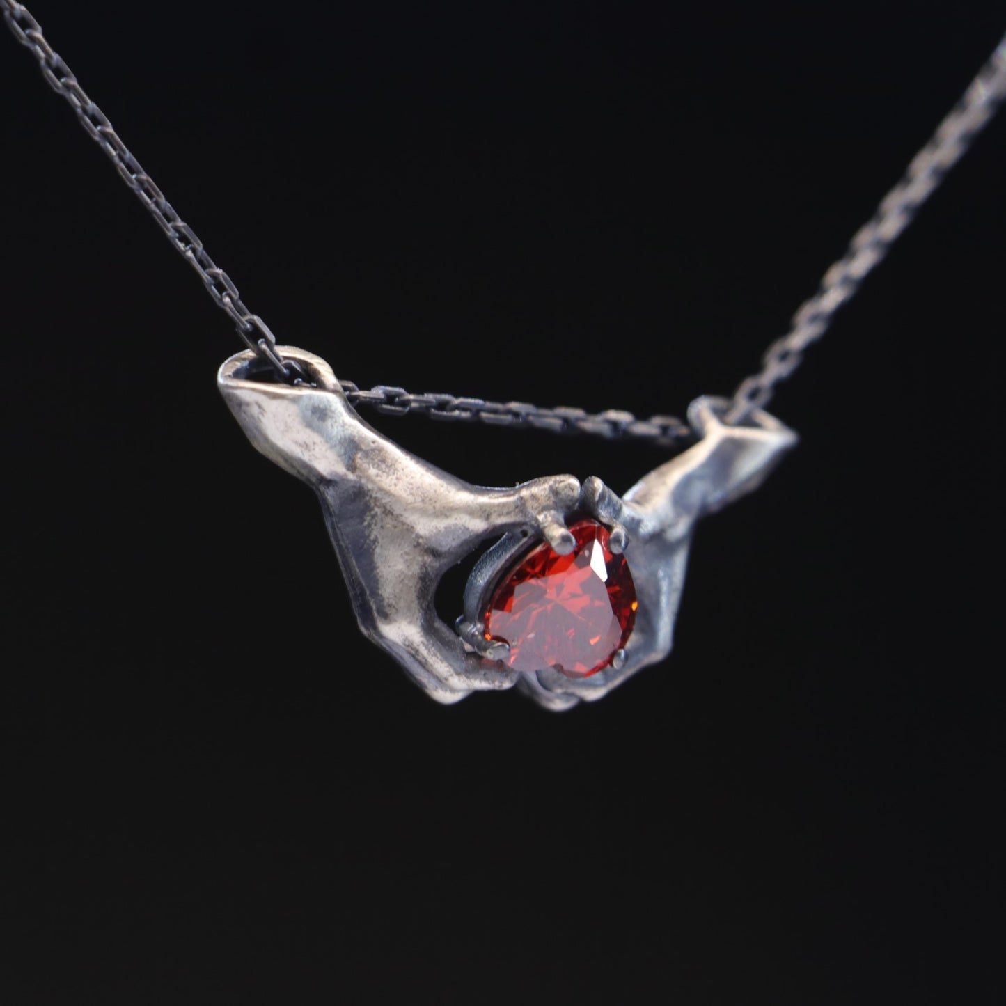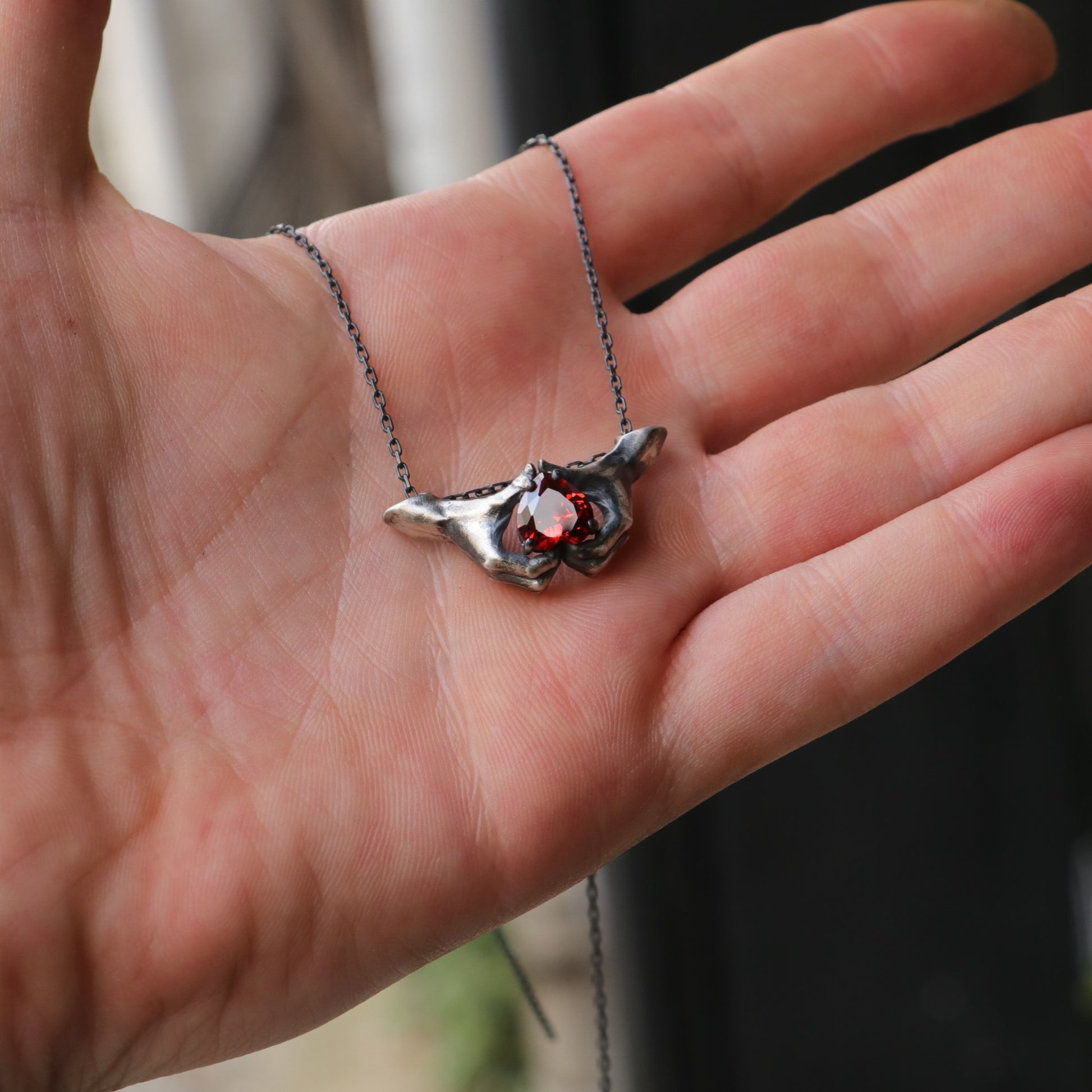 Hands Heart Garnet 925 Oxidized Silver Necklace