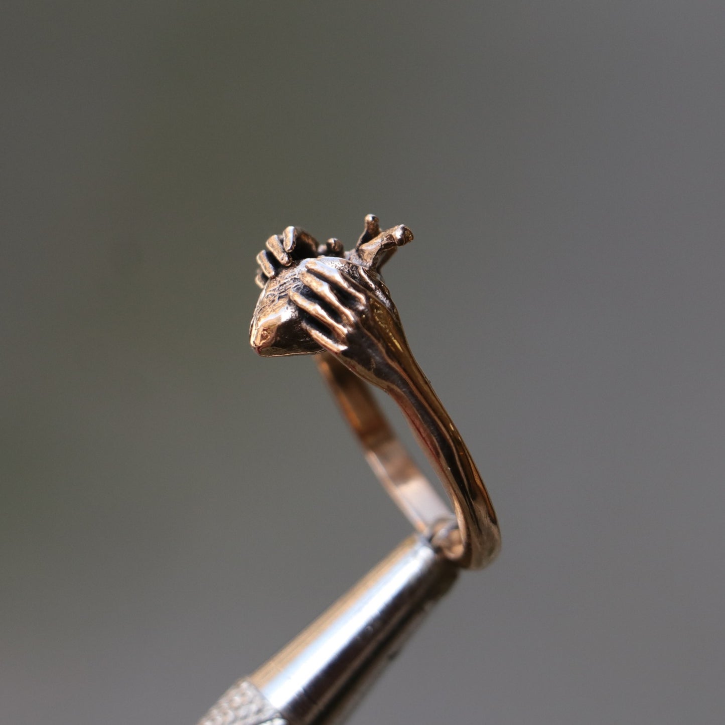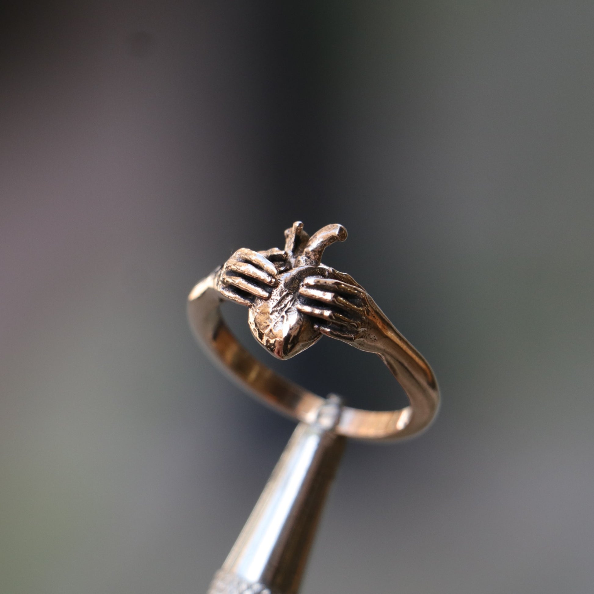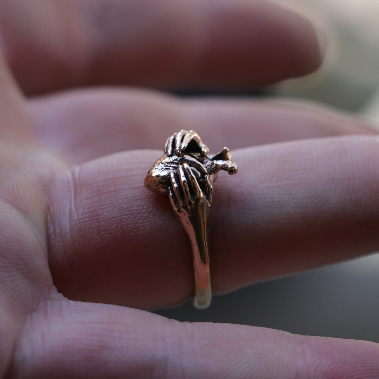 I oxidize and darken the bronze metal I use when creating my designs to give it an aged appearance and to make it look as if it had come out of the ground.