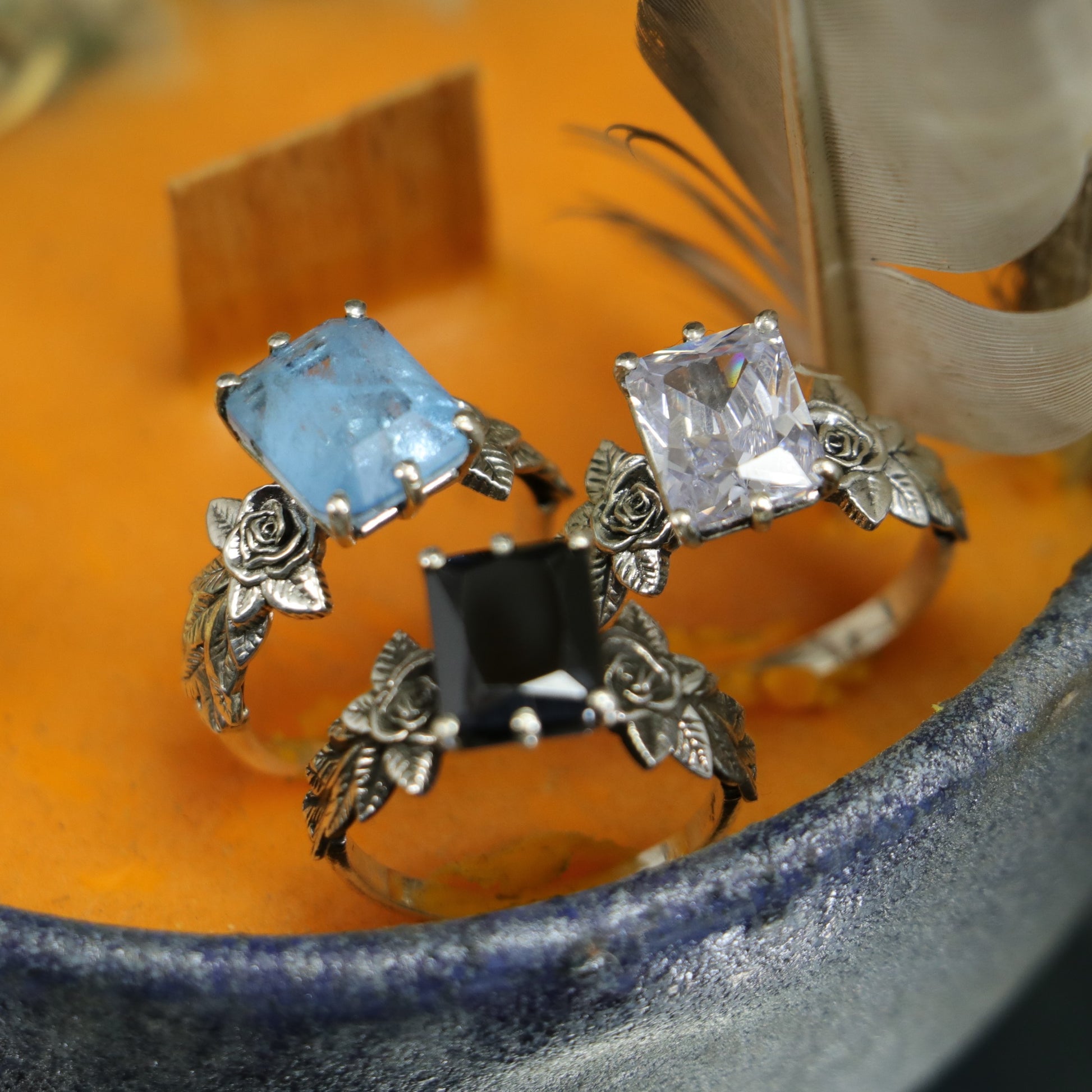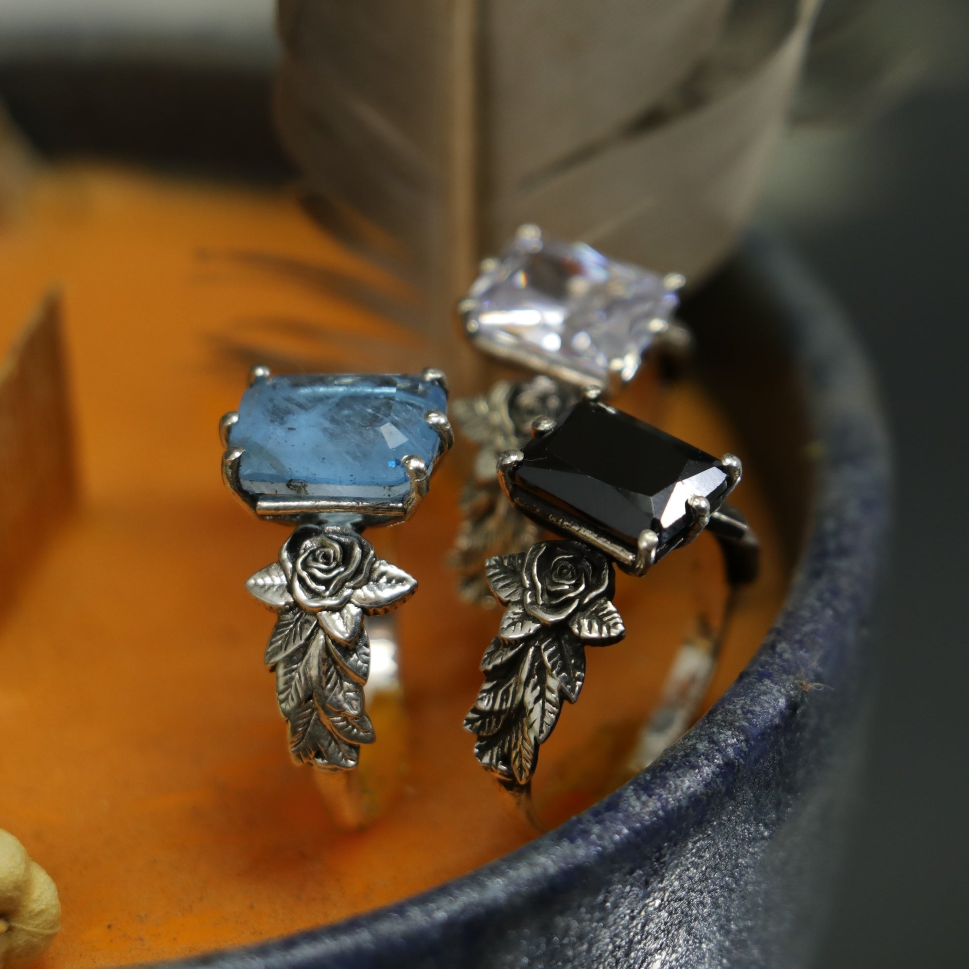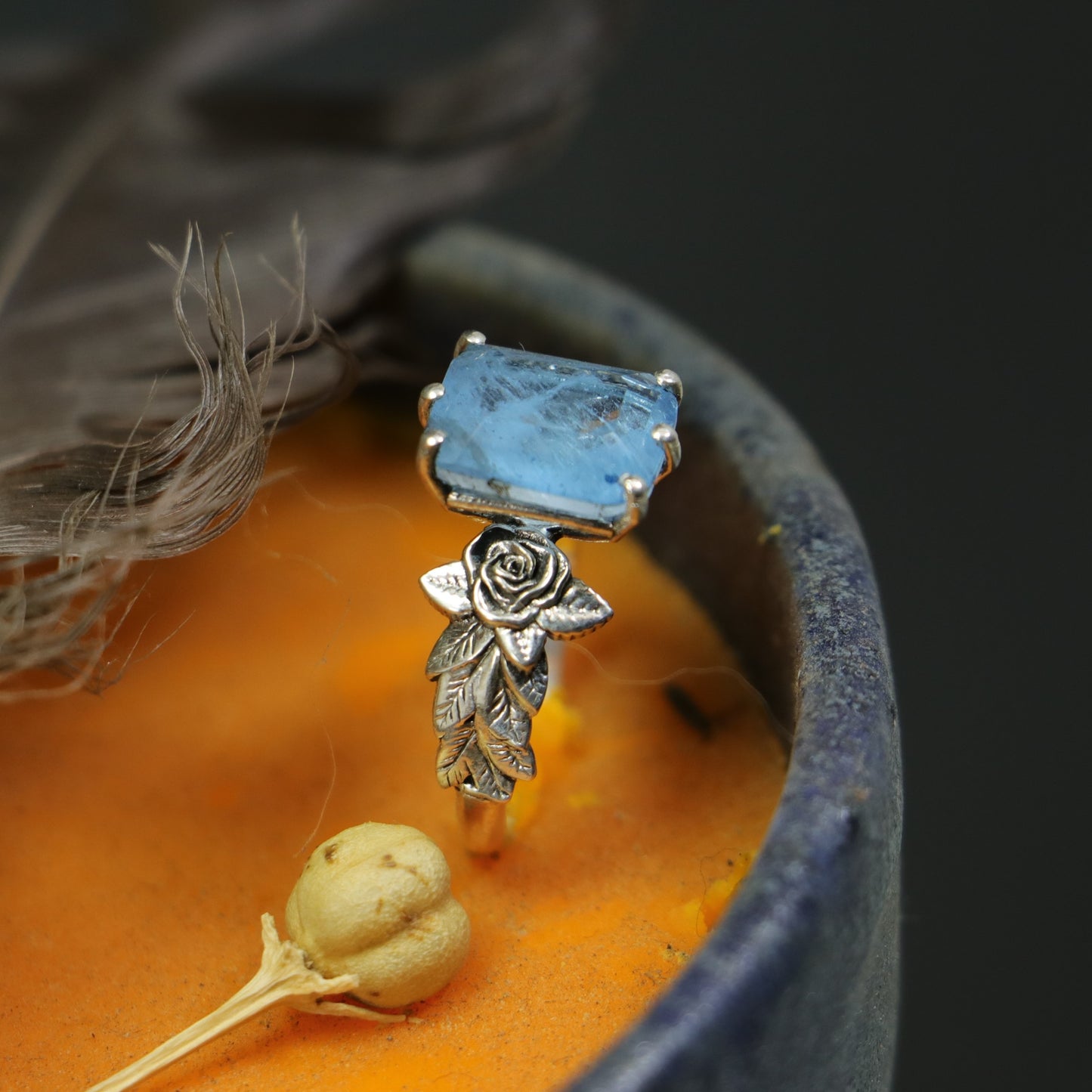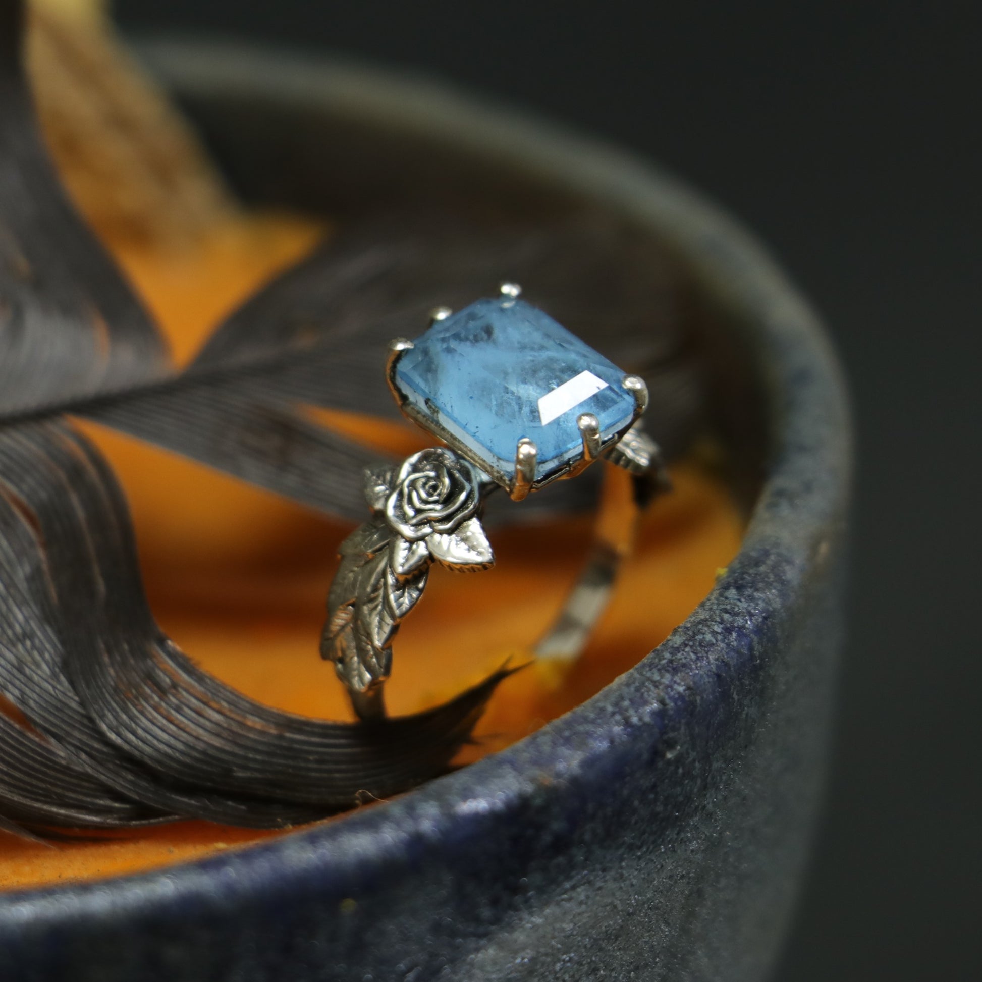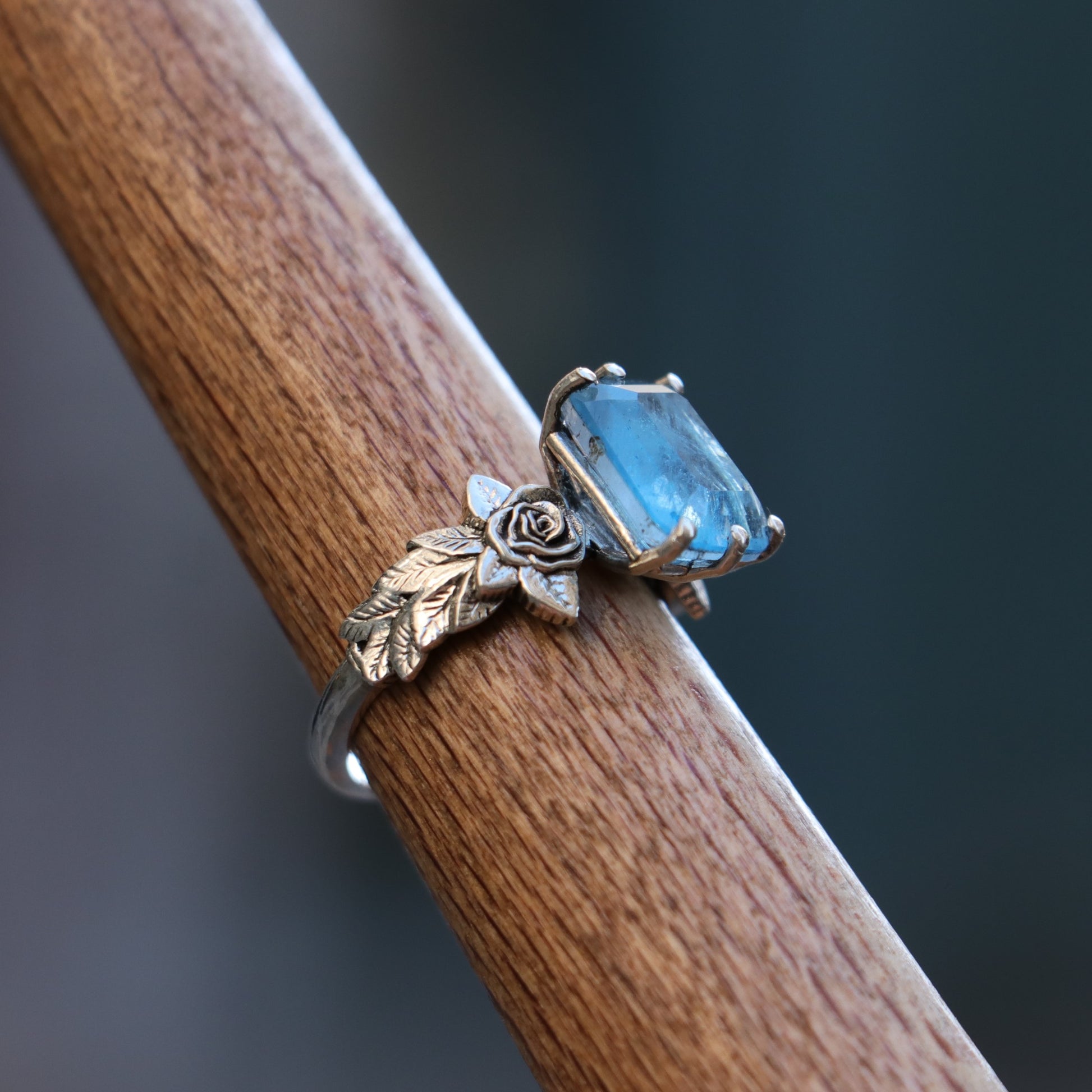 Emerald Cut Stem Aquamarine and Leaves 925 Silver Ring