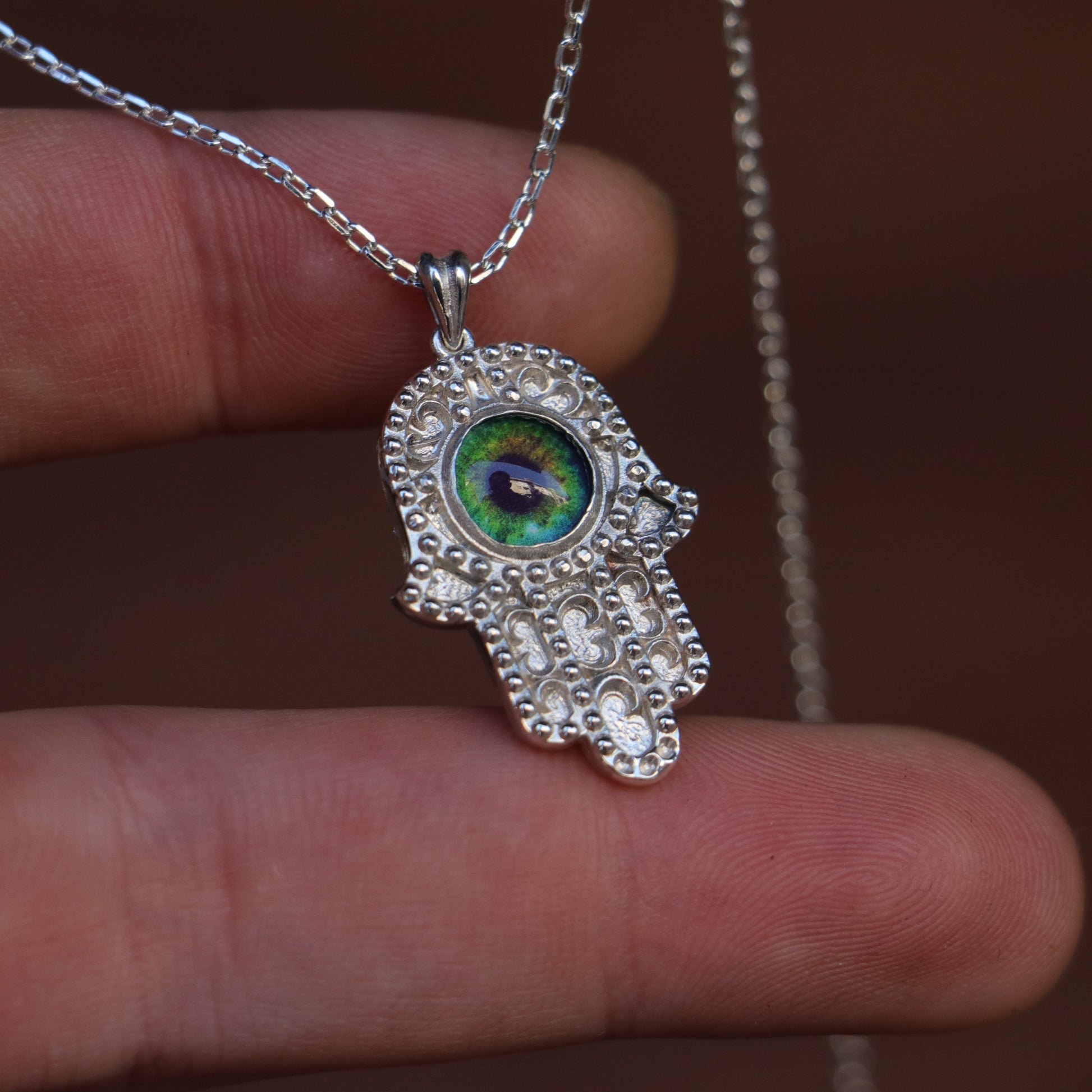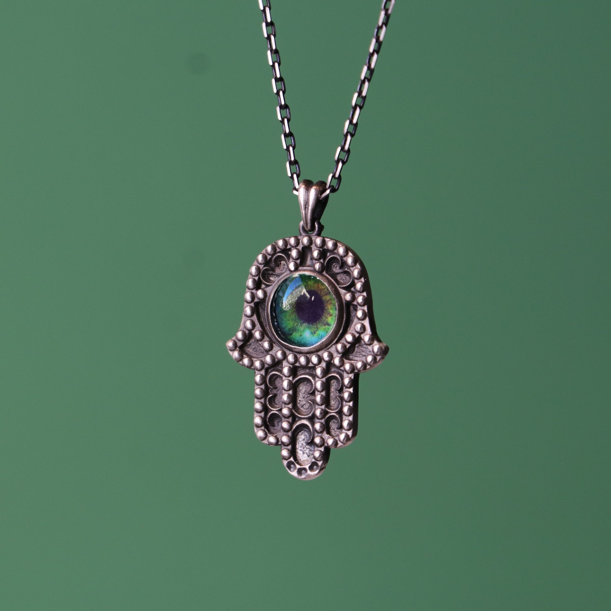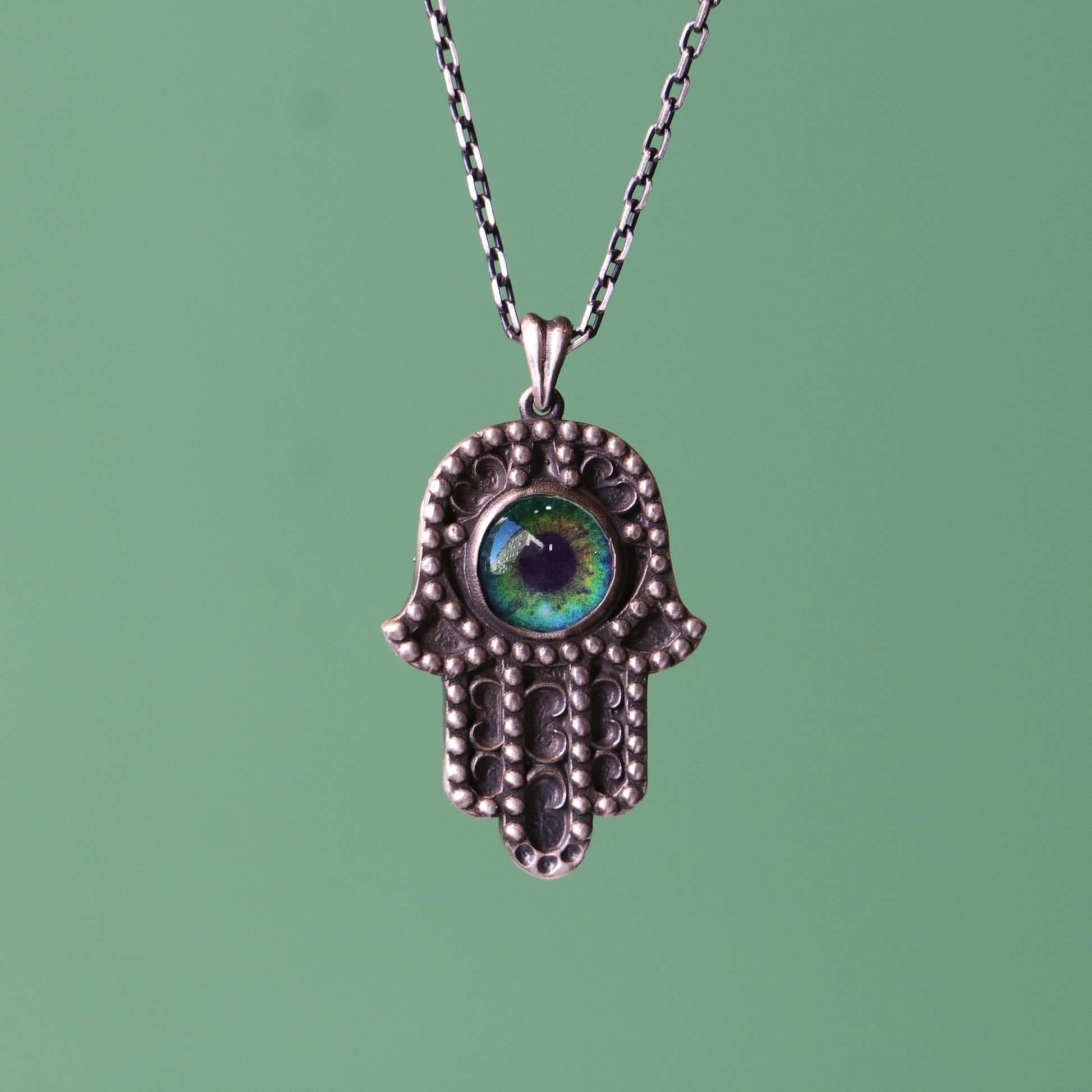 Fatima's Hand Green Eye 925 Oxidized Silver Necklace