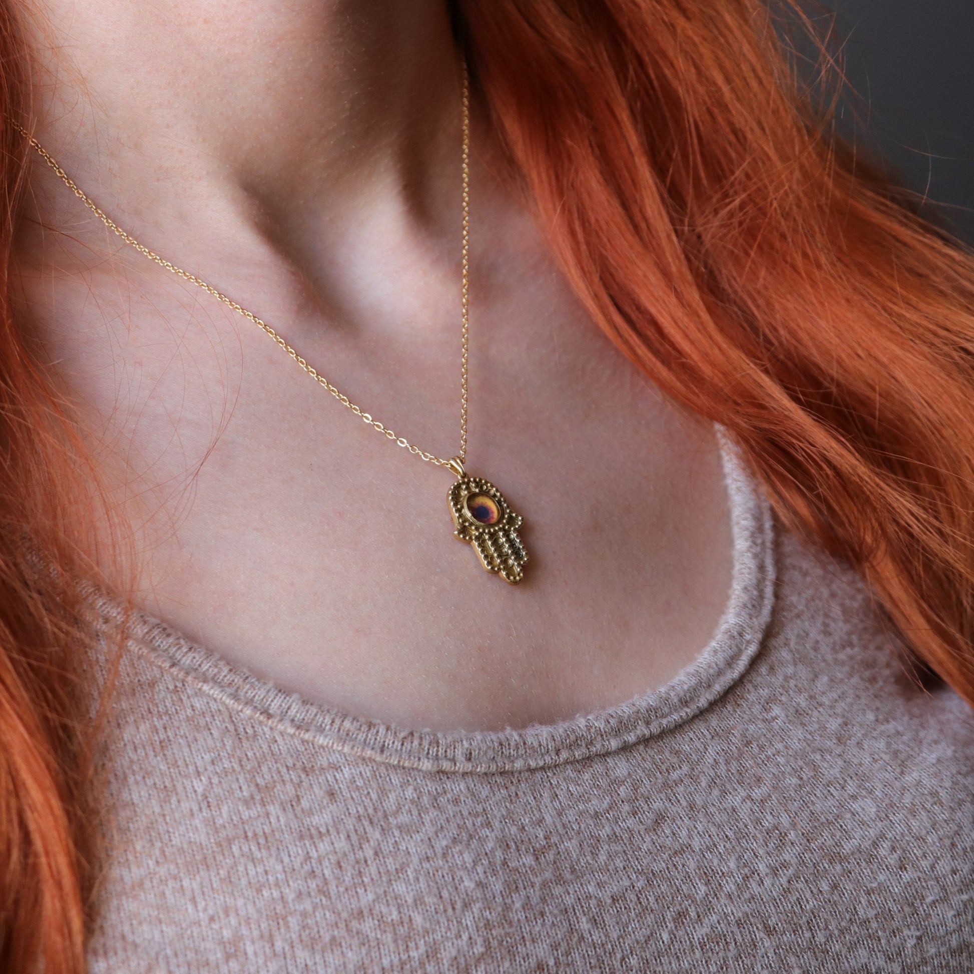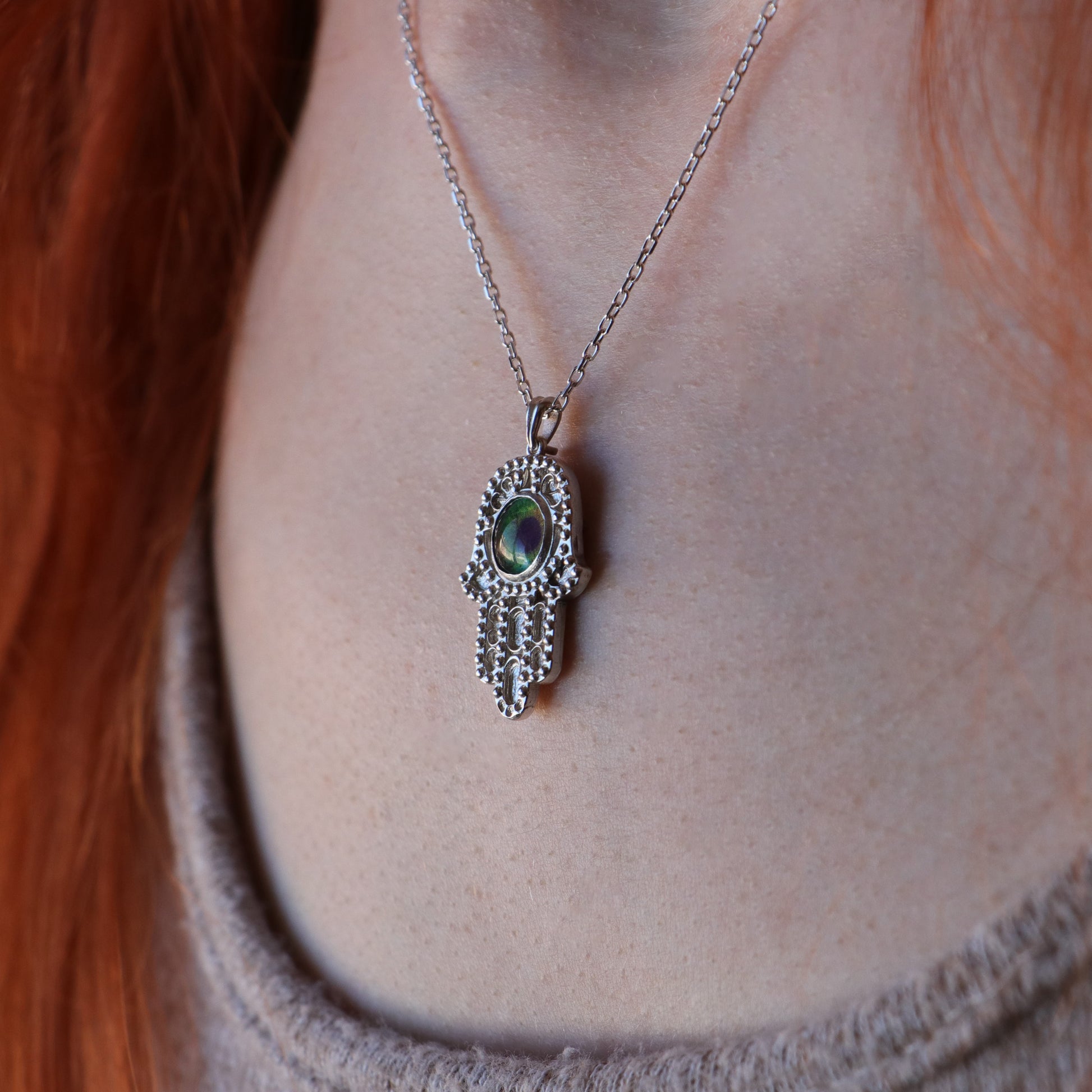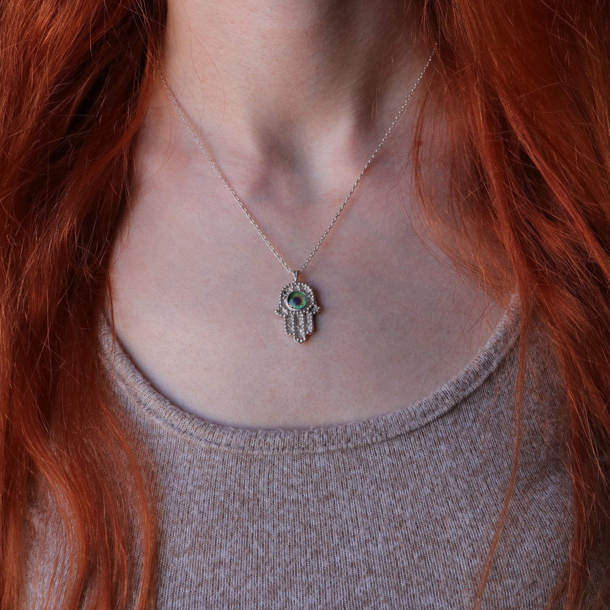 Fatima's Hand Green Eye 925 Oxidized Silver Necklace