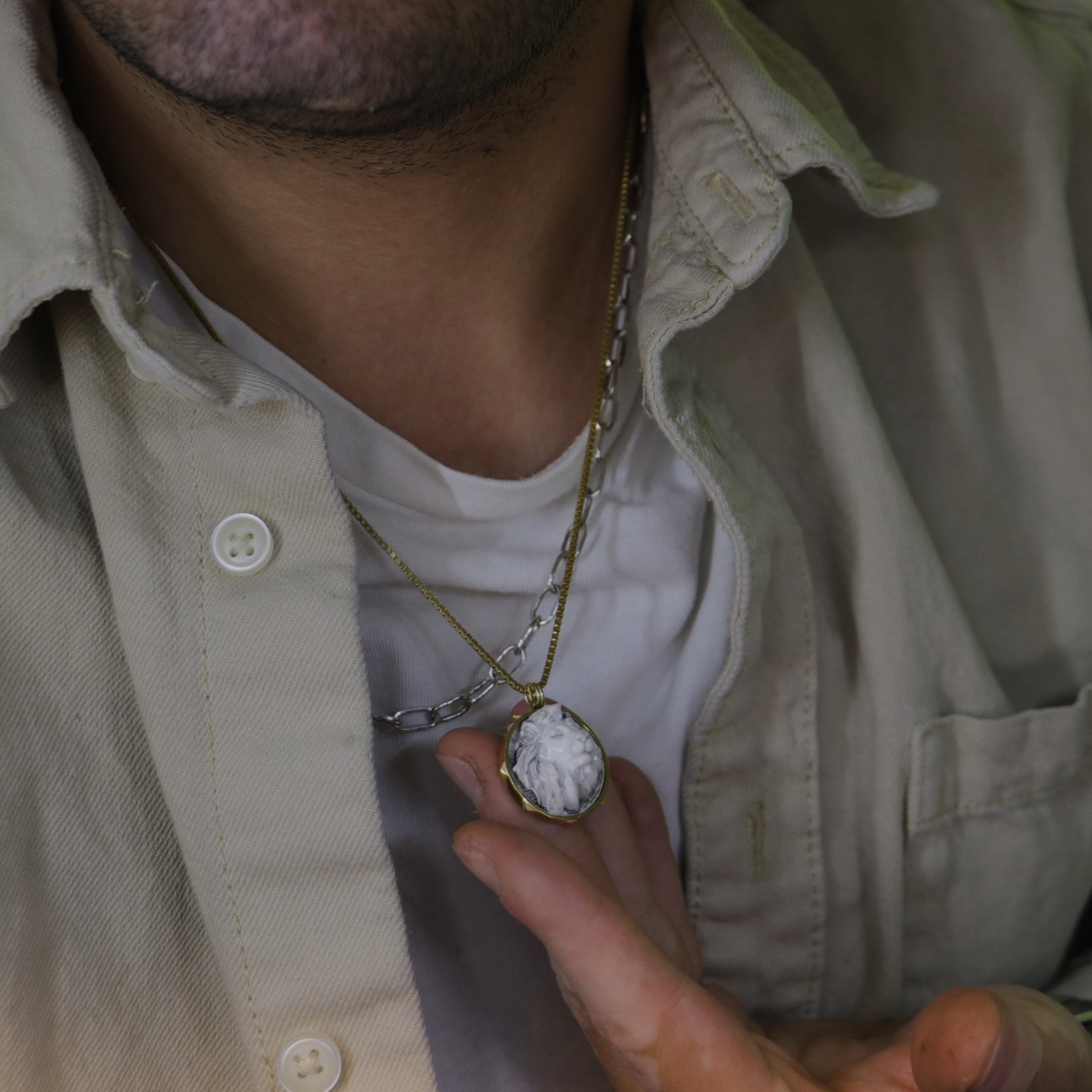 In my improvised designs, which are inspired by the emotions evoked by the raw, natural stones I use, I combine stones using the "nailing" technique, an old-fashioned craft, without using any chemical ingredients.