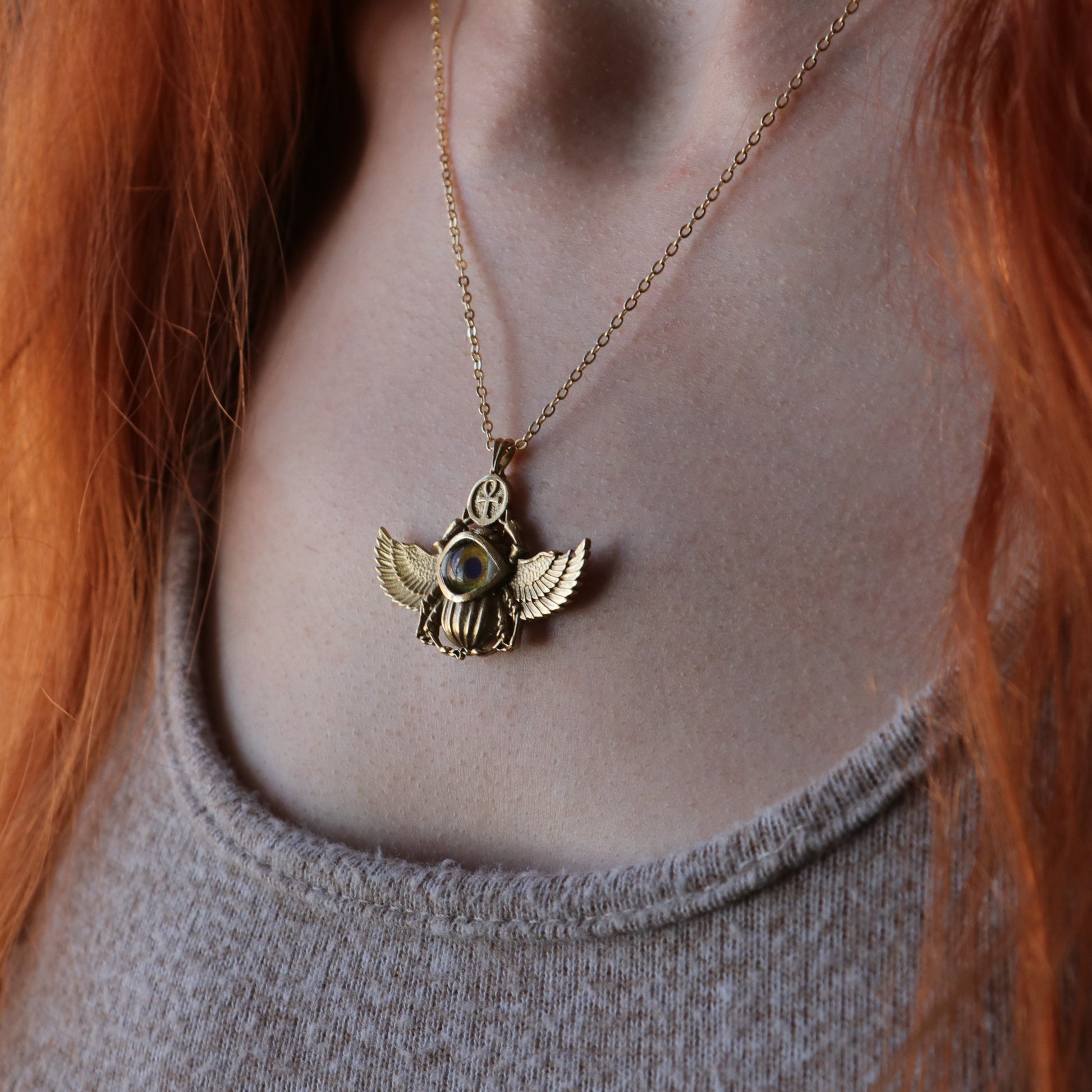 Scarab & Kanatlar: Mısır mitolojisinde güneşin gökyüzündeki yolculuğunu ve yeniden doğuşu simgeleyen kanatlı Scarab, detaylı el işçiliğiyle her bir tüyüne kadar titizlikle işlenmiştir.