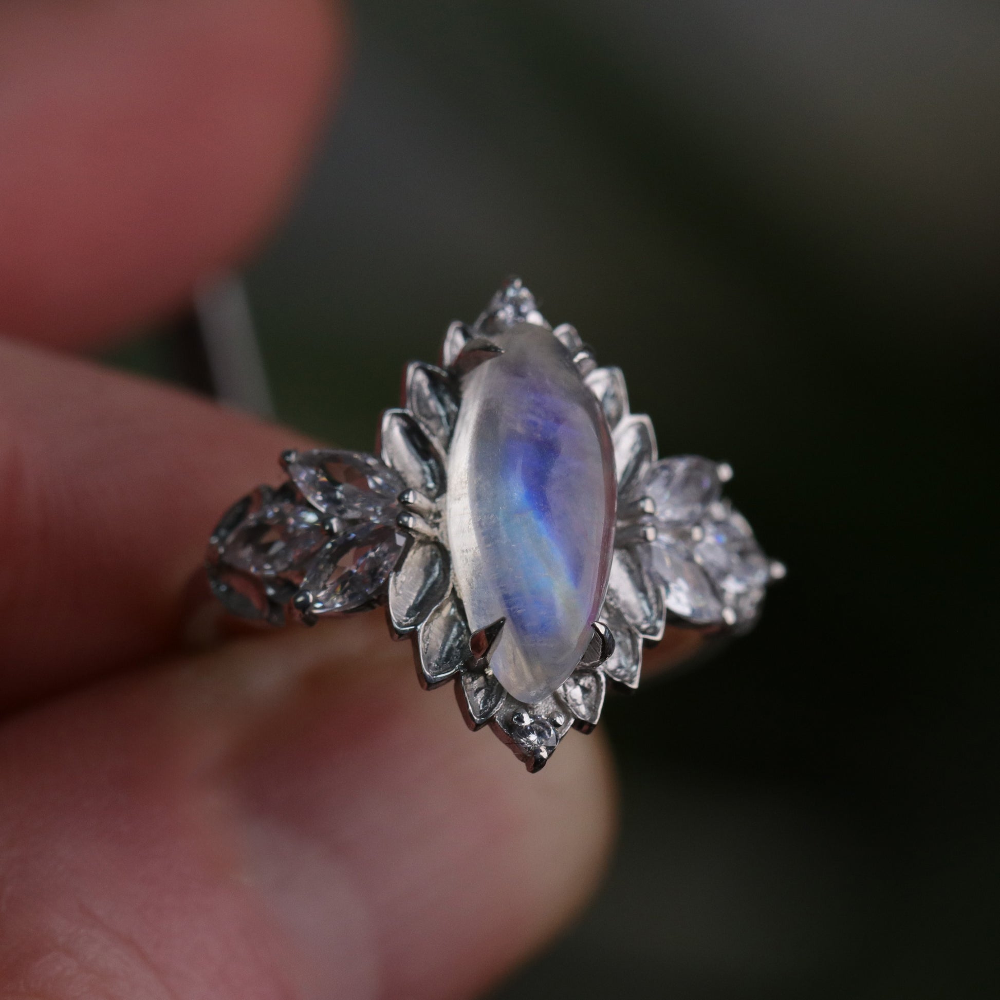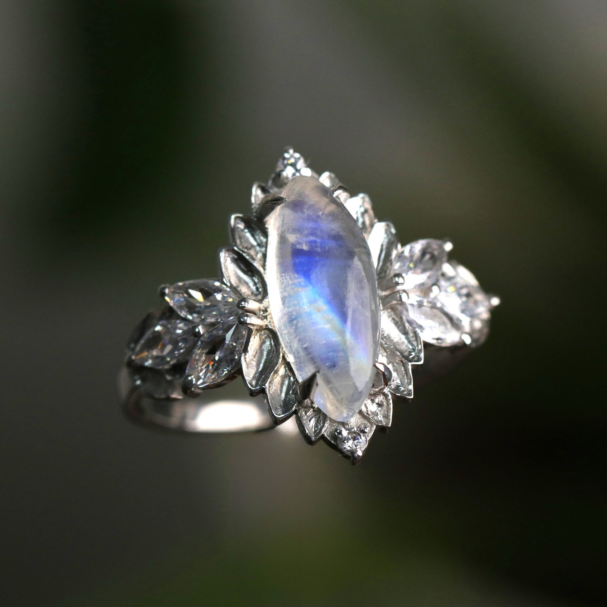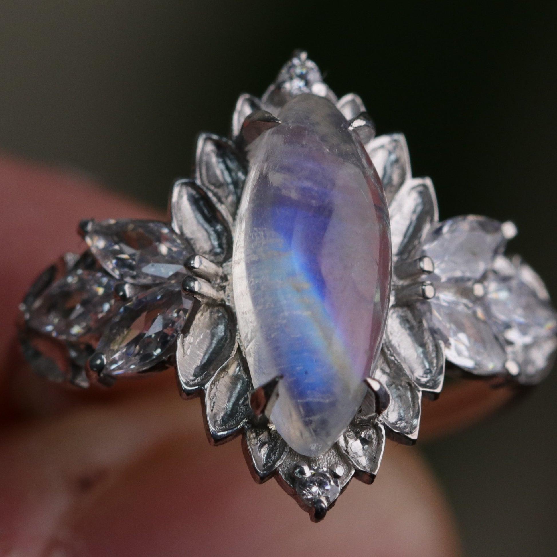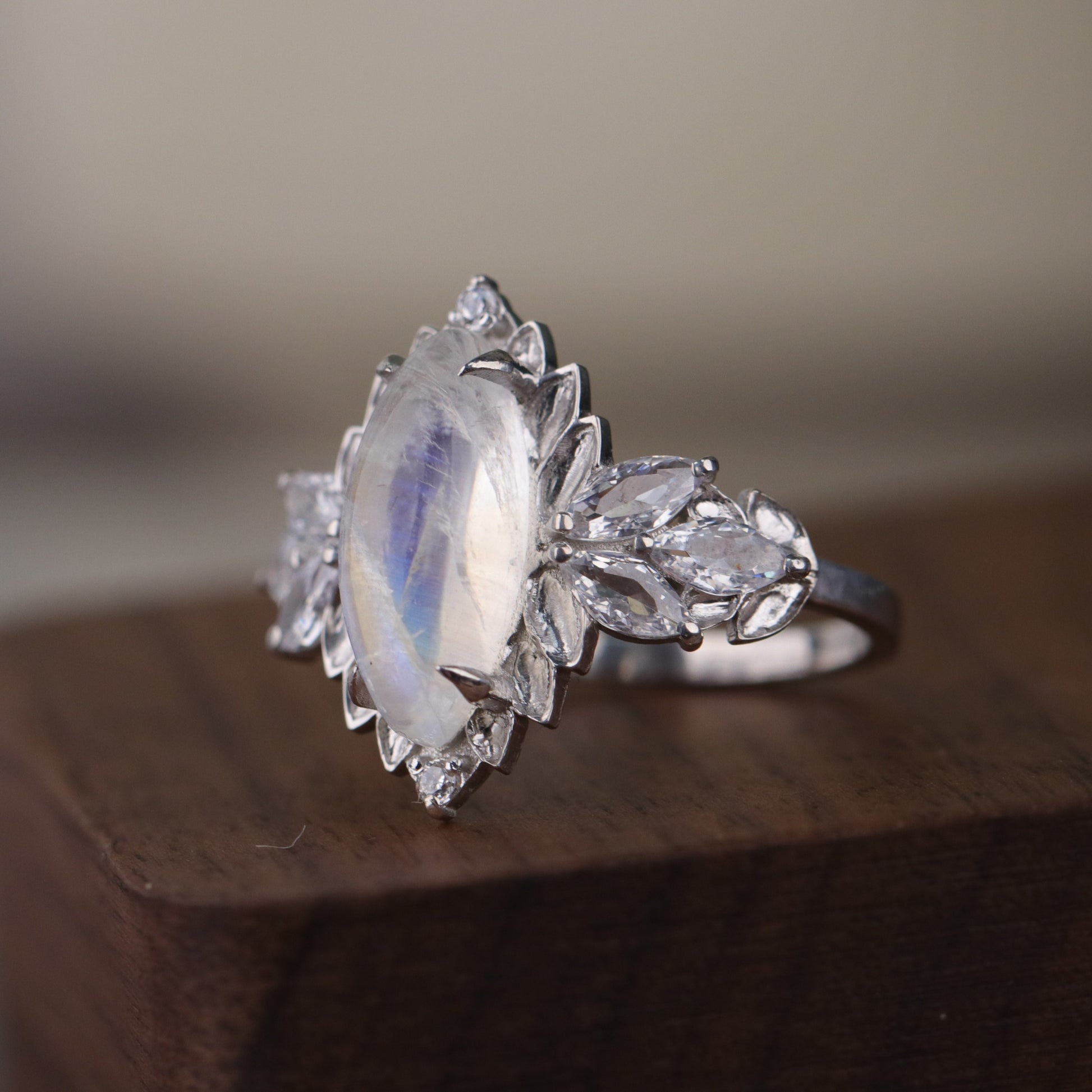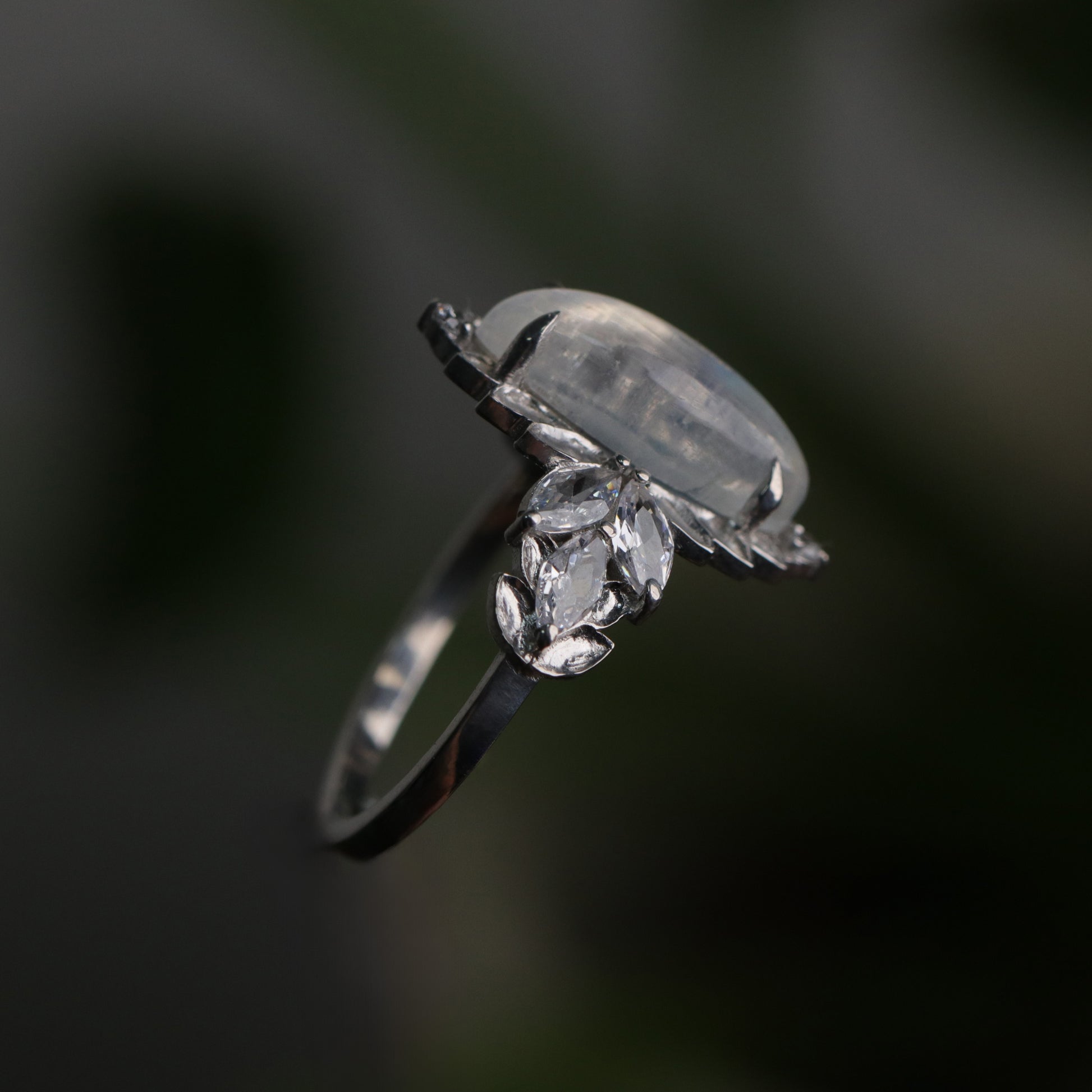 Özel Tasarım Ay Taşı ve Pırlanta 14 Ayar Beyaz Altın Yüzük