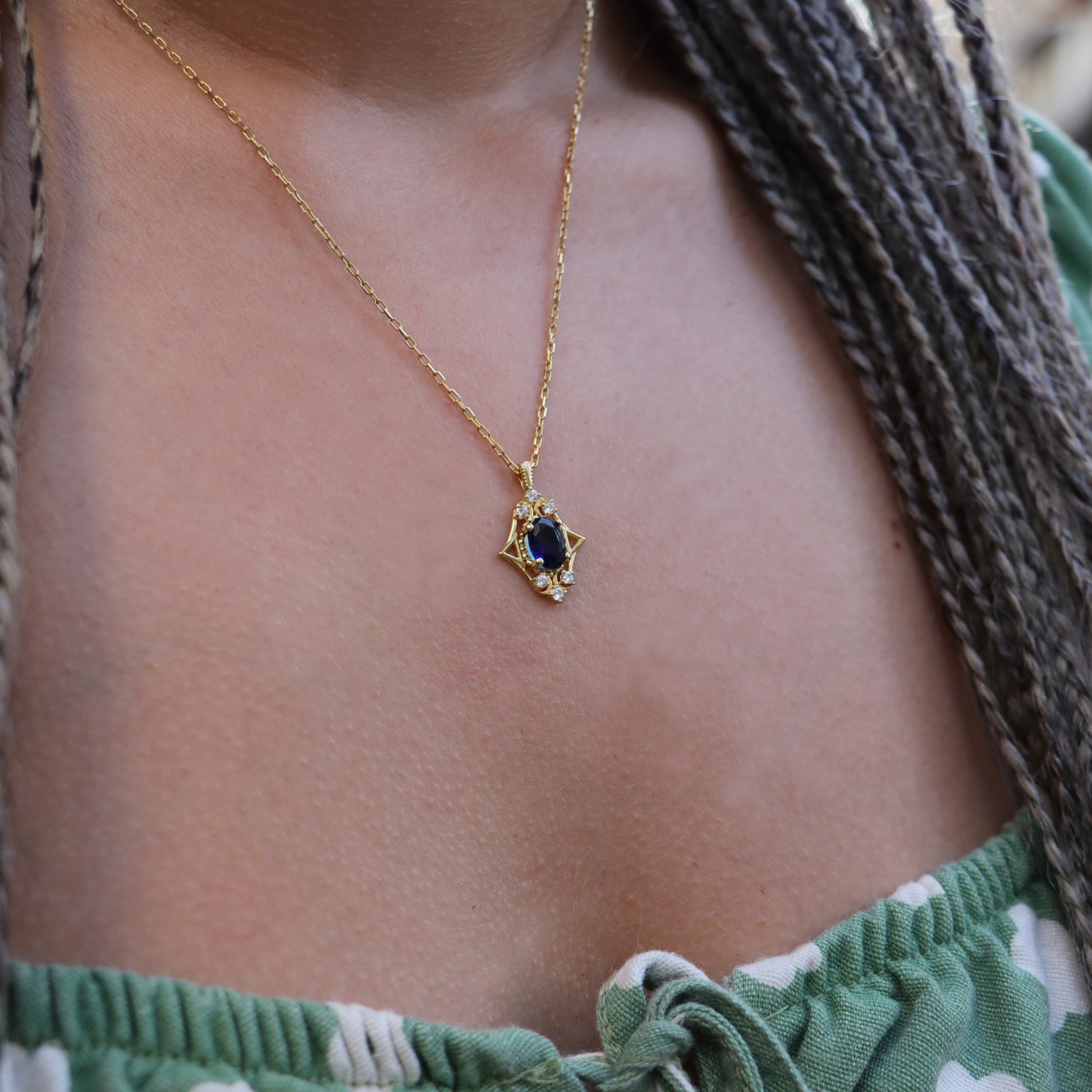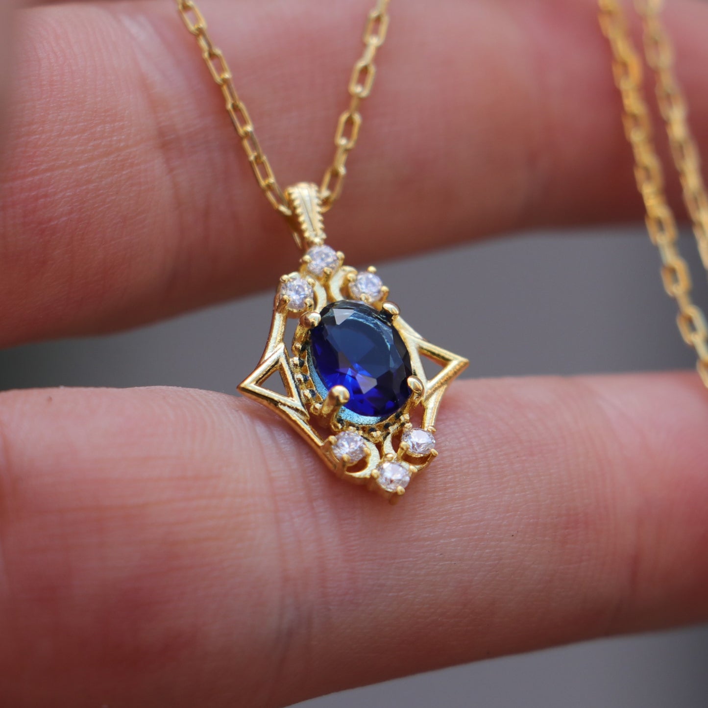 Safir ve Mozanit 925 Gümüş Altın Kaplama Kolye