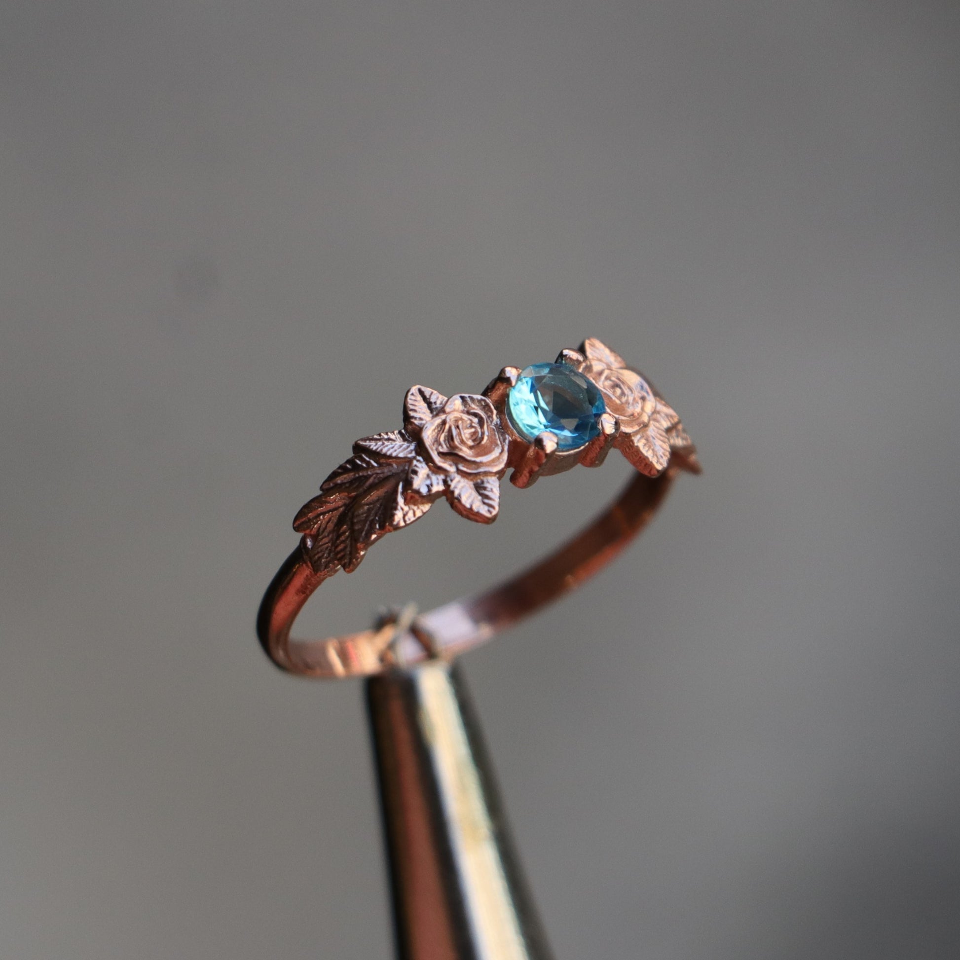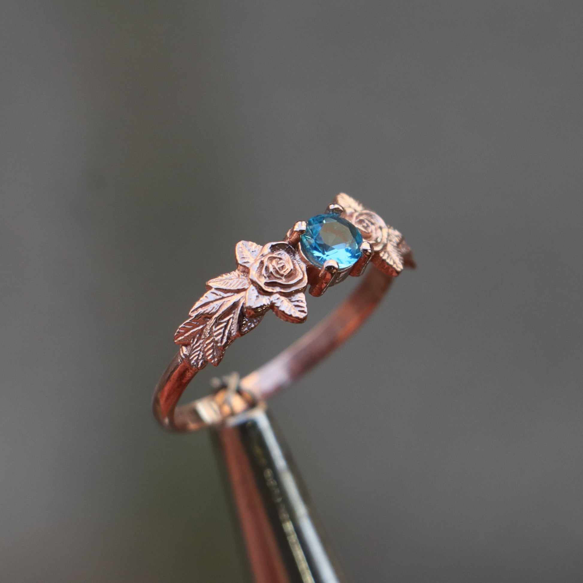 Yapraklar Blue Topaz 925 Gümüş Rose Altın Kaplama Yüzük